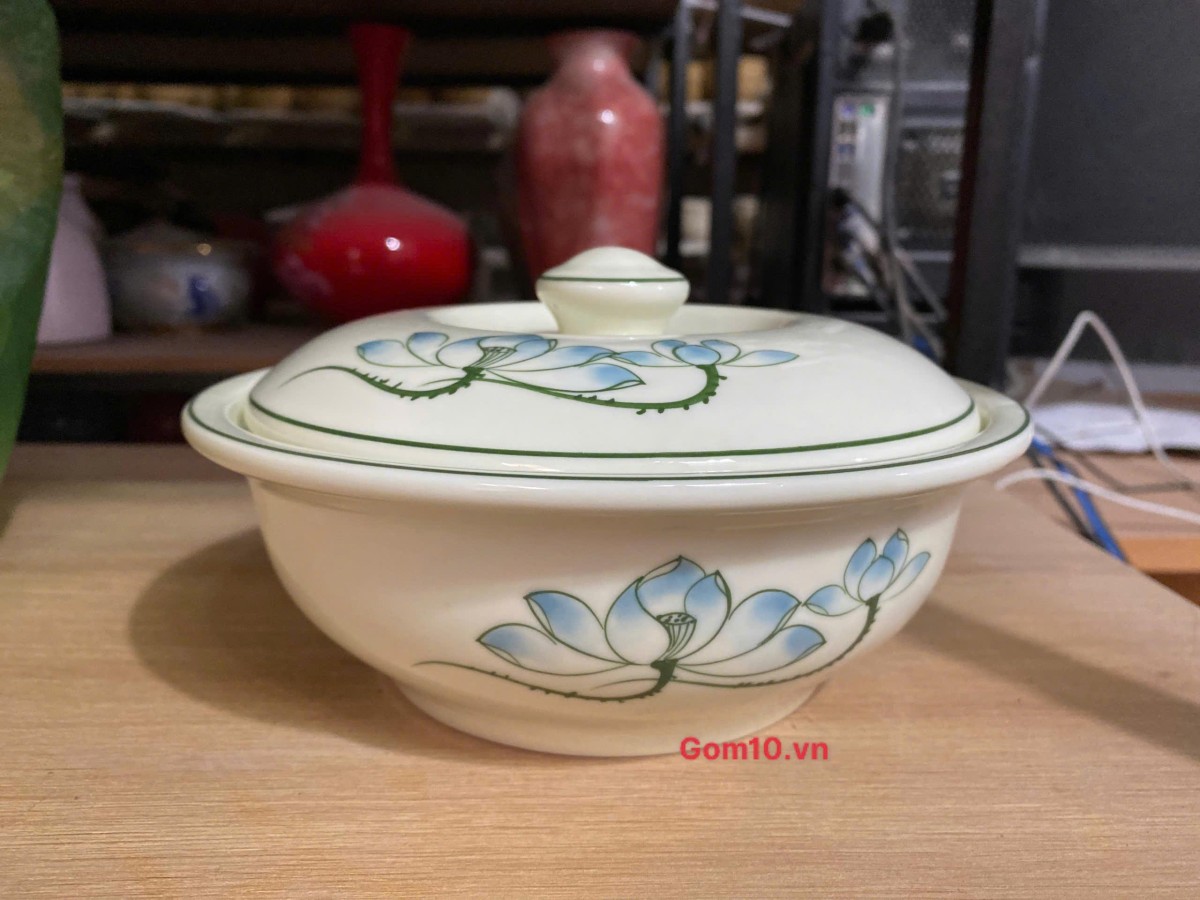 Âu cơm men kem vẽ hoa Sen xanh, đường kính 20cm