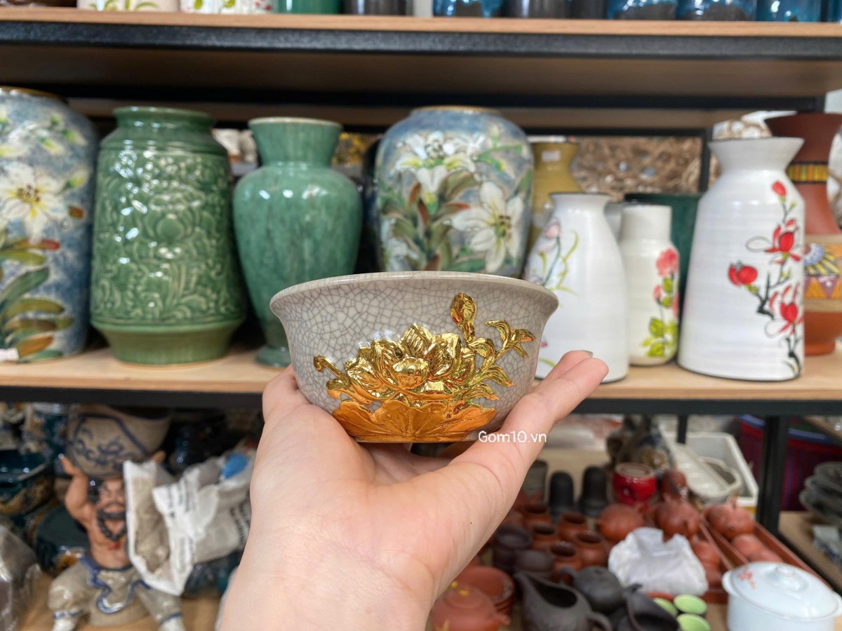 Bát thờ men rạn đắp nổi sen cát tường dát vàng 24k