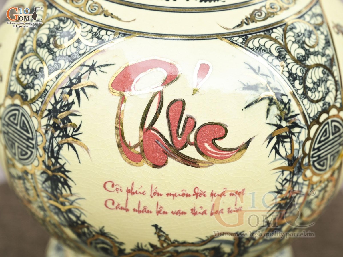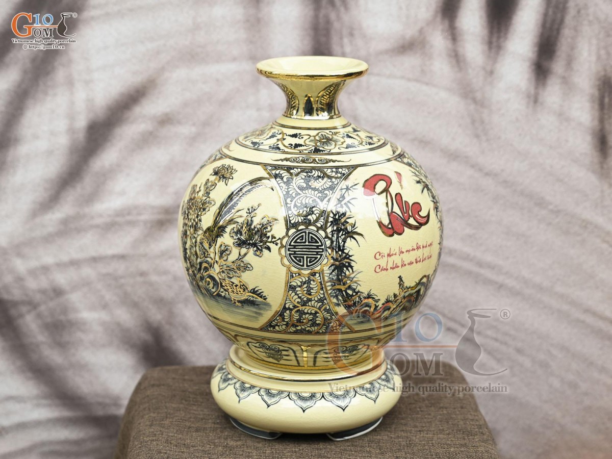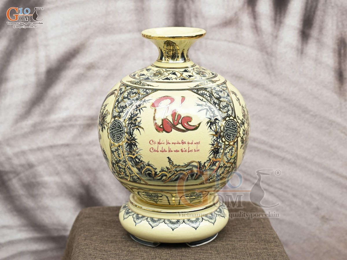Bình hút lộc men cổ họa tiết Tứ Cảnh Vinh Hoa Phú Quý chữ Phúc vẽ vàng 24k, cao 36cm (cả đế)