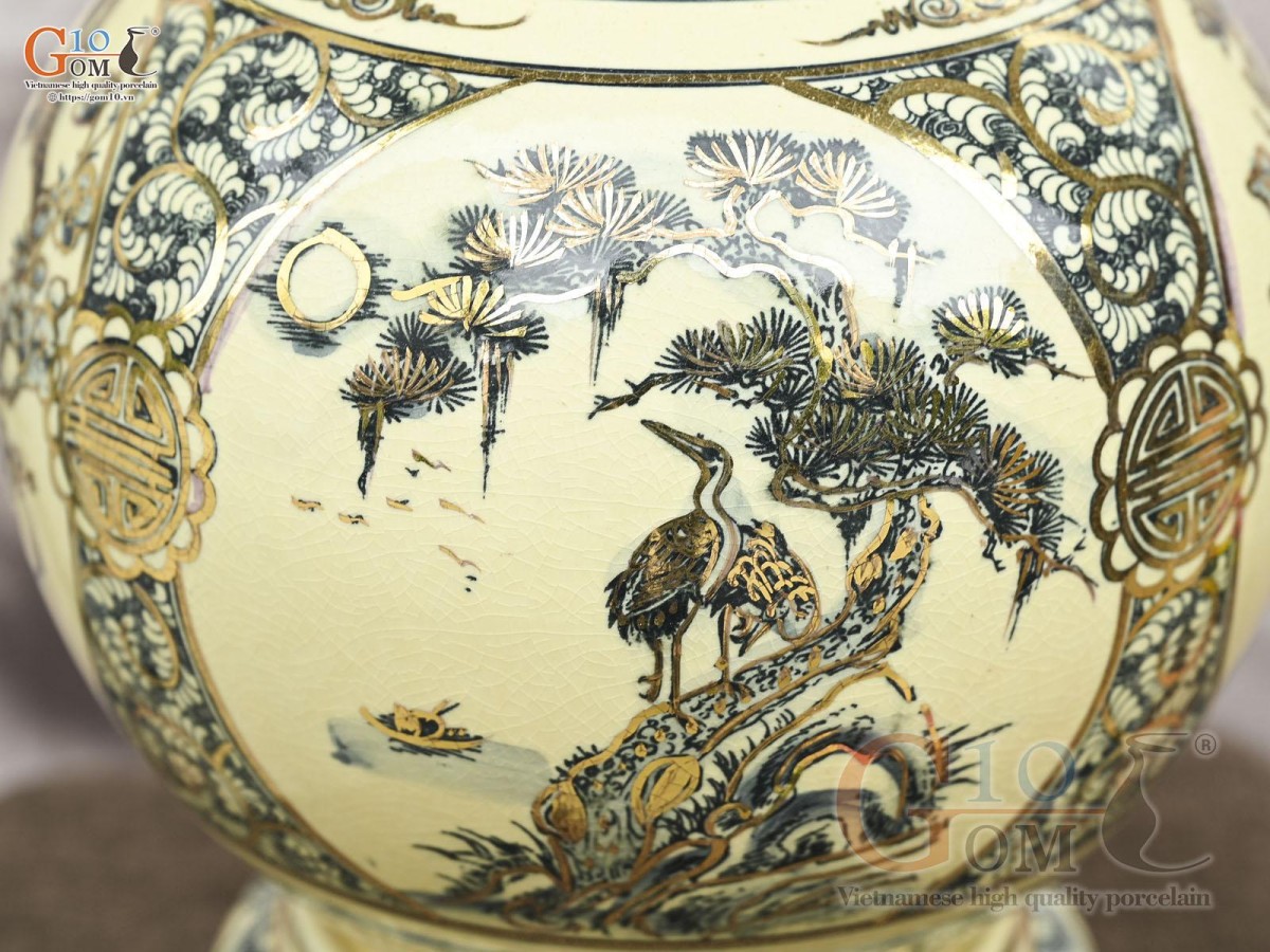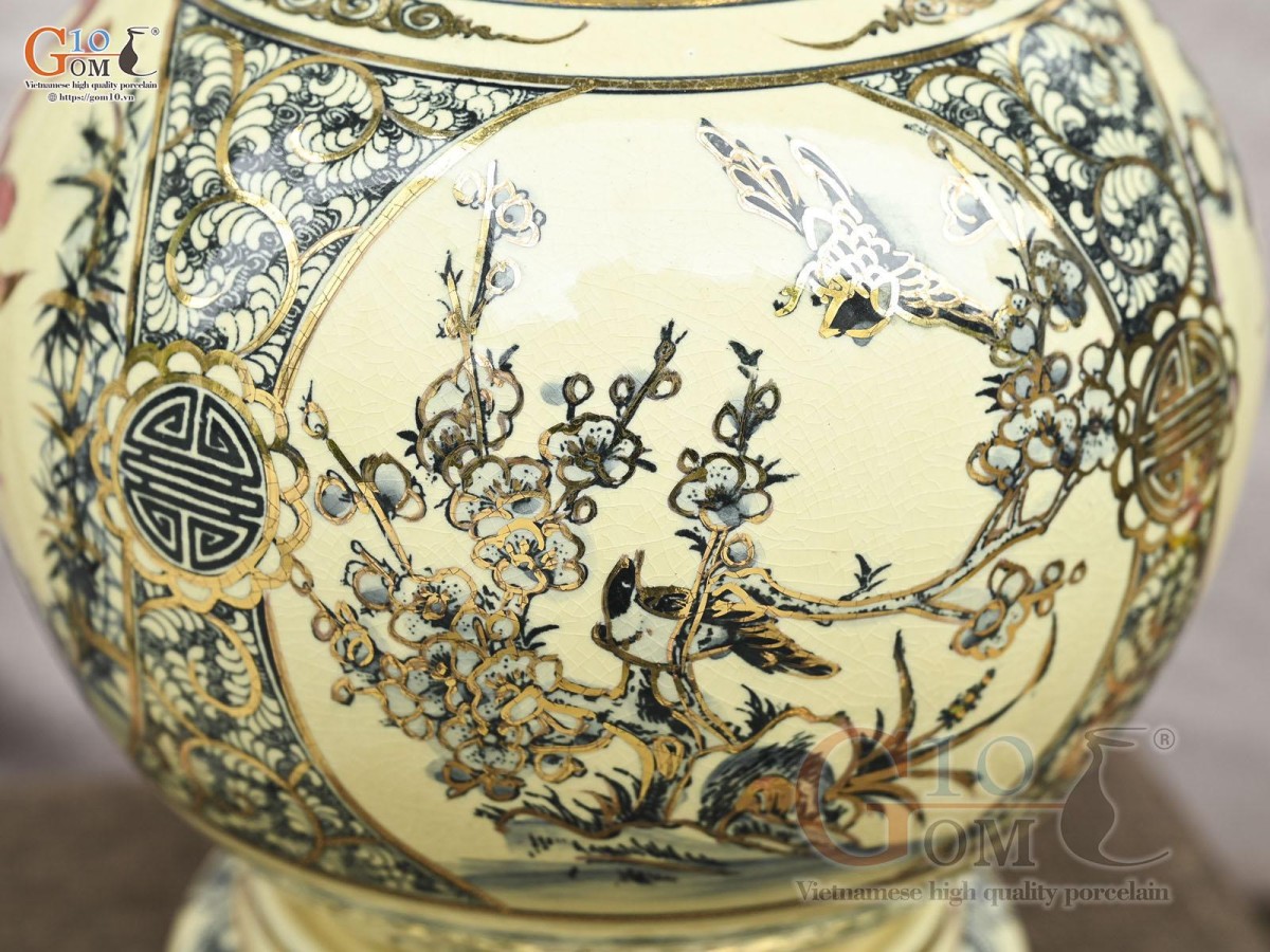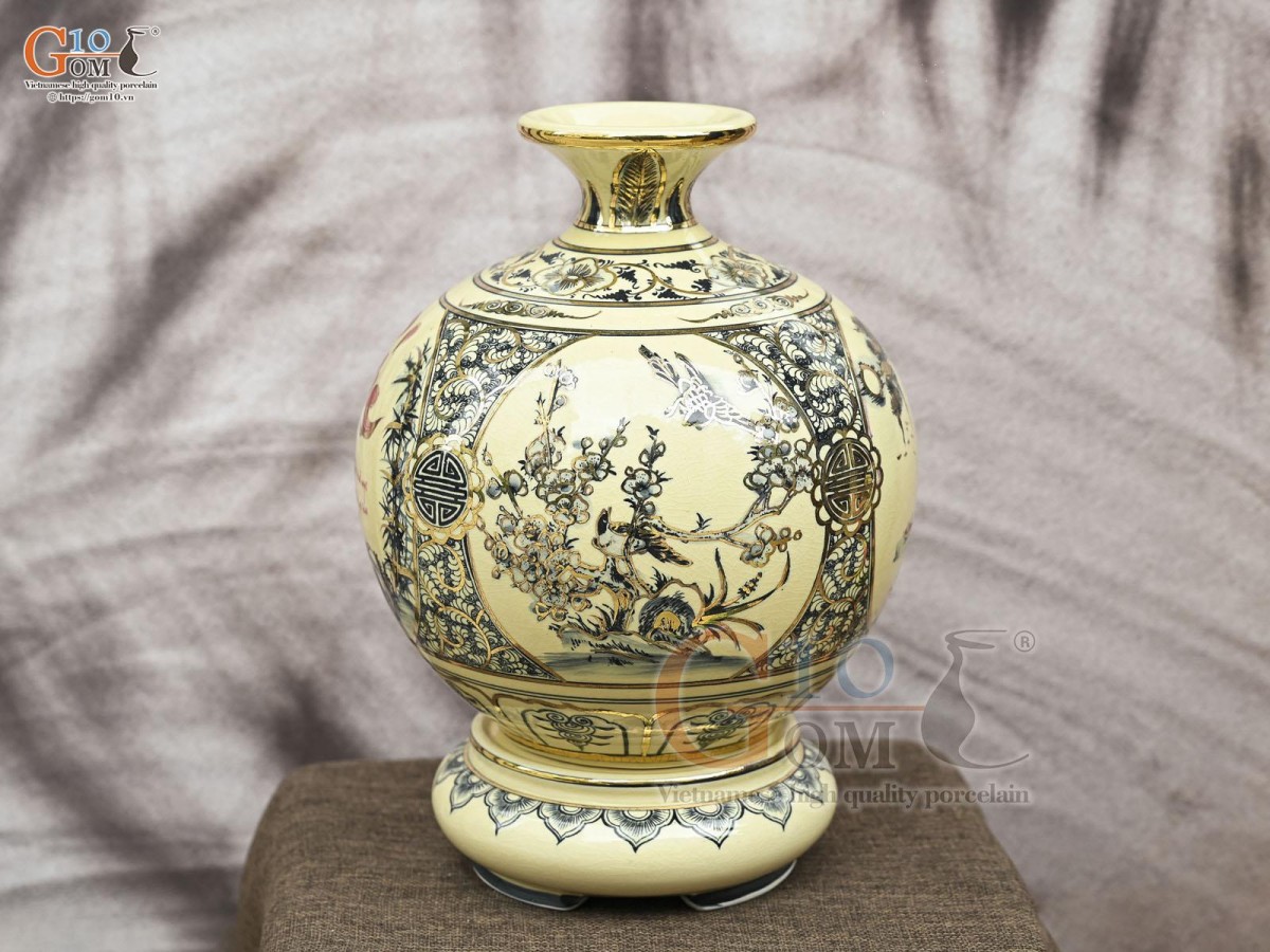 Bình hút lộc men cổ họa tiết Tứ Cảnh Vinh Hoa Phú Quý chữ Phúc vẽ vàng 24k, cao 36cm (cả đế)