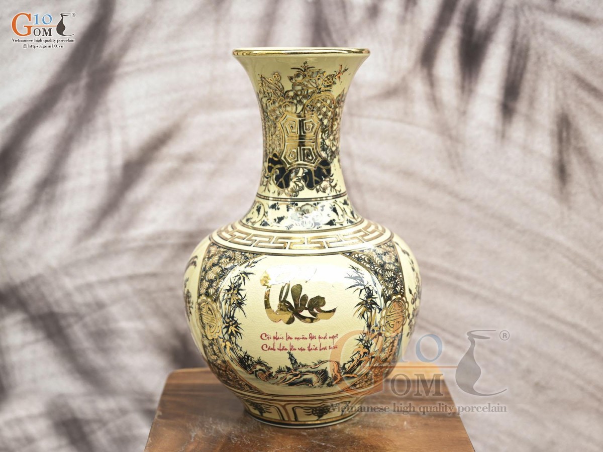 Bình tỏi men cổ họa tiết tứ cảnh chữ Phúc vẽ vàng 24k, cao 36cm