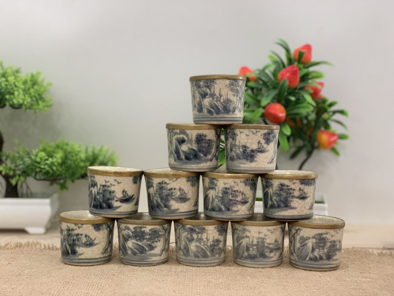 Bộ 12 chén tích nhỏ men rạn bọc đồng cảnh sơn thủy, cao 5cm Bộ 12 chén tích nhỏ men rạn bọc đồng cảnh sơn thủy, cao 5cm