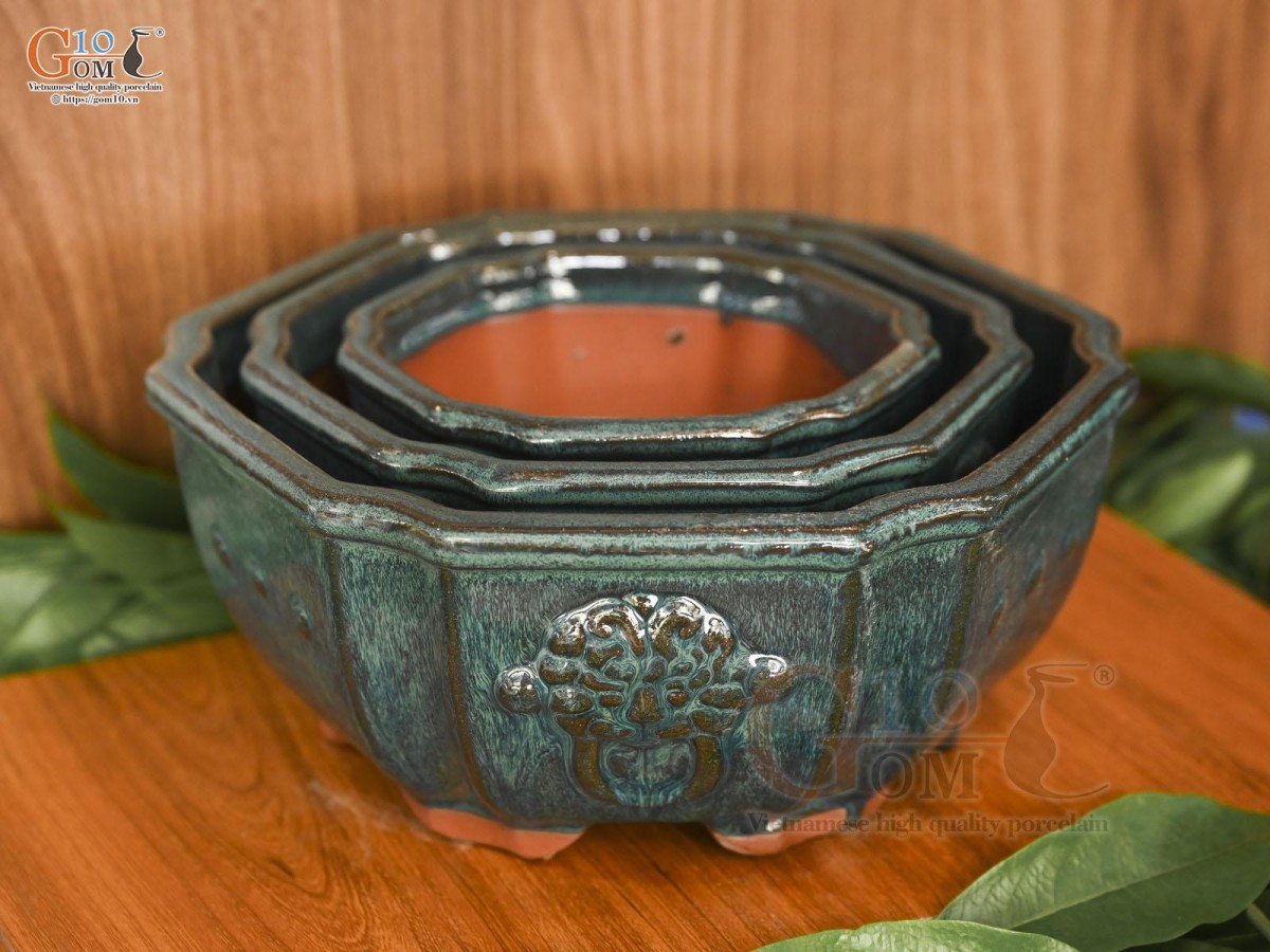Chậu cây Bát Tràng họa tiết cổ điển như sơn thủy, tứ cảnh, họa tiết sen, rồng rất thích hợp dùng để trồng bonsai và các loại cây cảnh khác. Ngoài ra, thiết kế lỗ thoát nước trong lòng chậu giúp cây không bị úng nước.