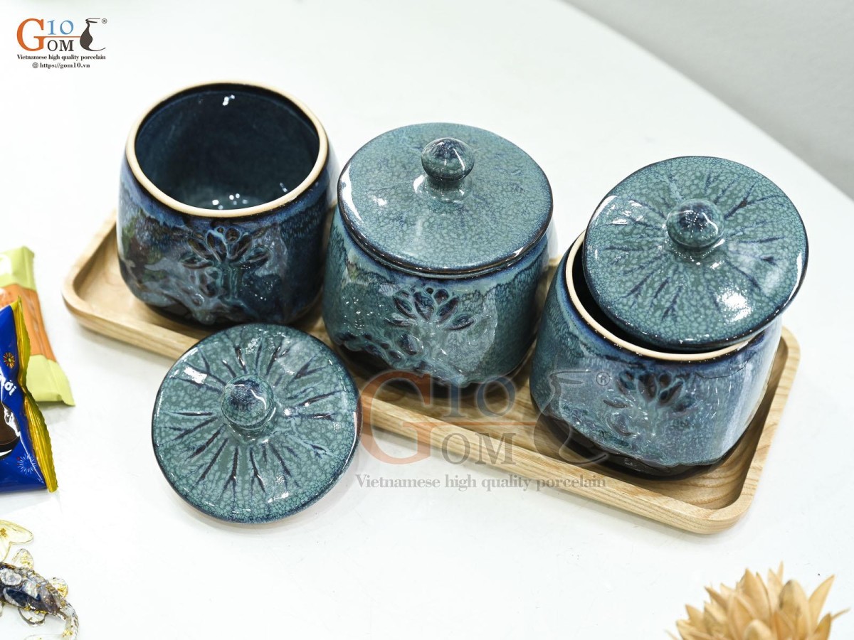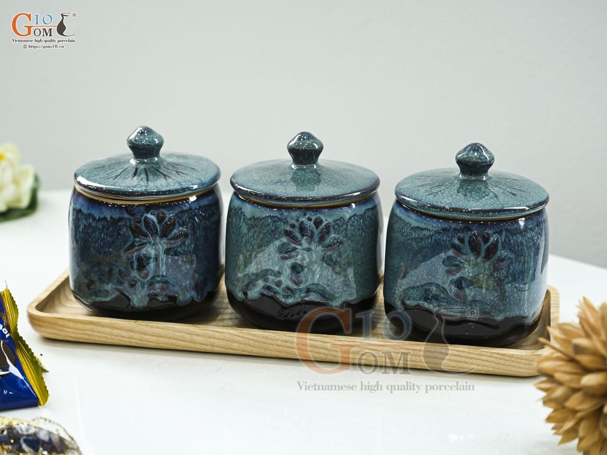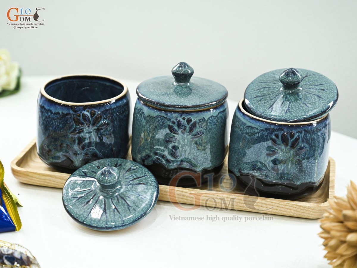 Bộ 3 hũ có nắp men cẩm thạch đắp nổi hoa Sen, cao 12cm