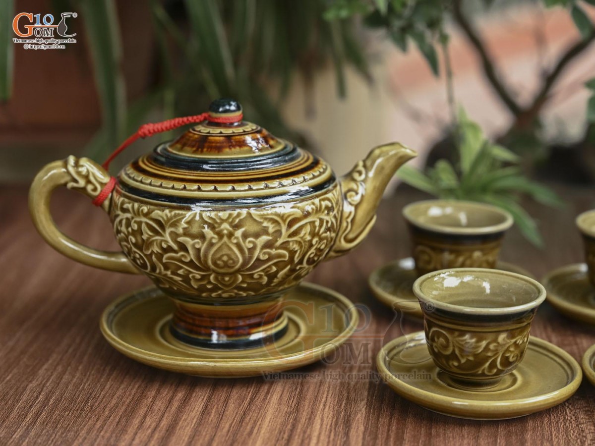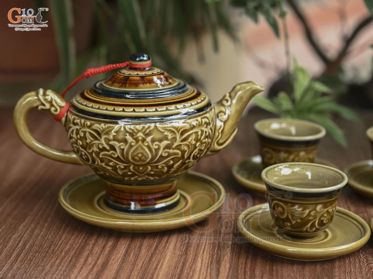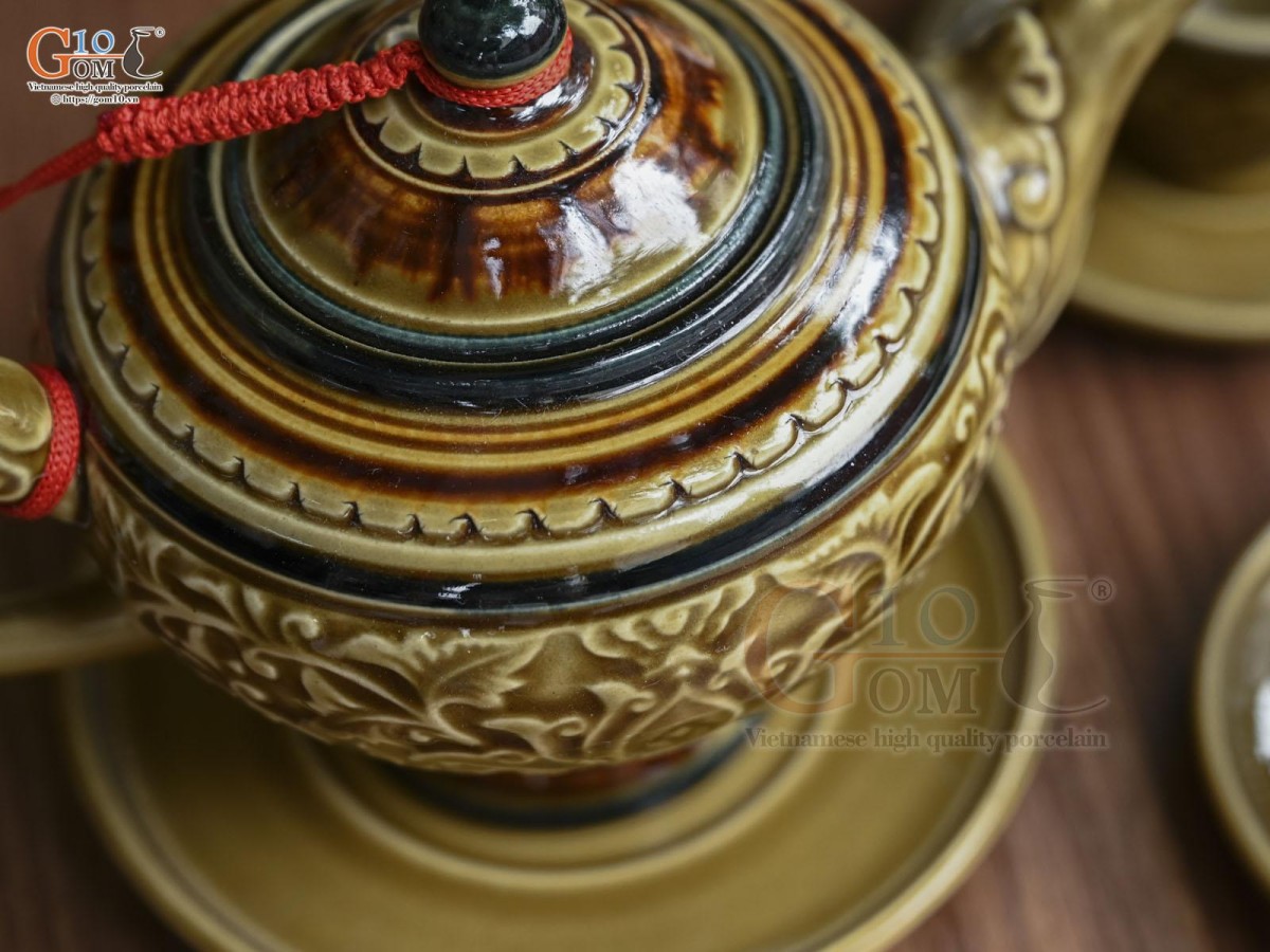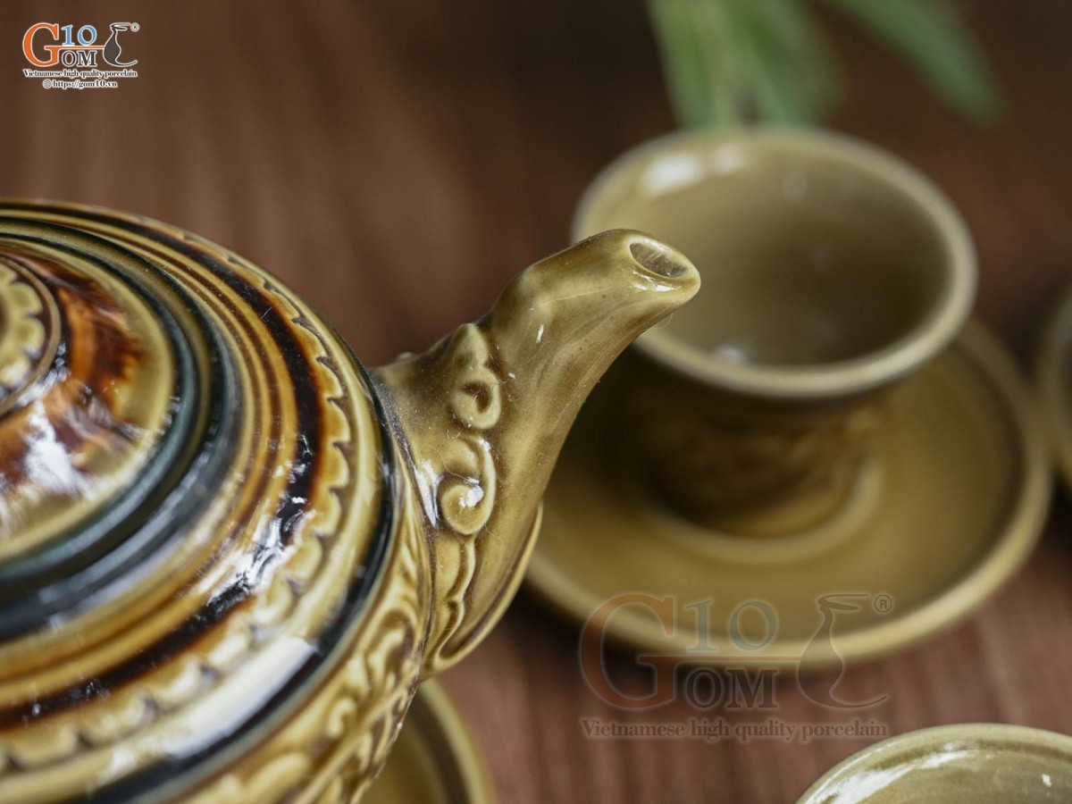 Bộ ấm chén dáng chân thon men cổ khắc nổi hoa sen màu vàng rêu, 350ml