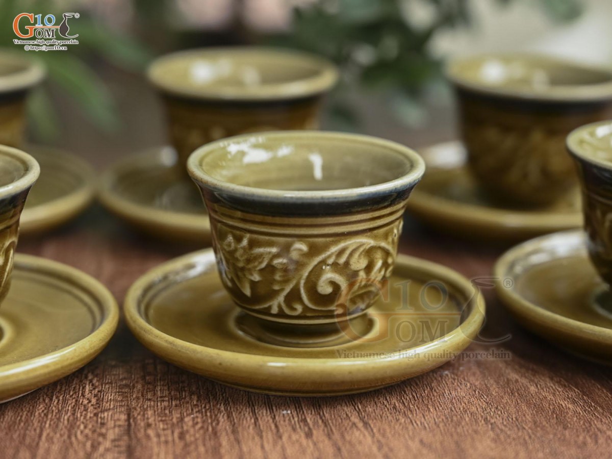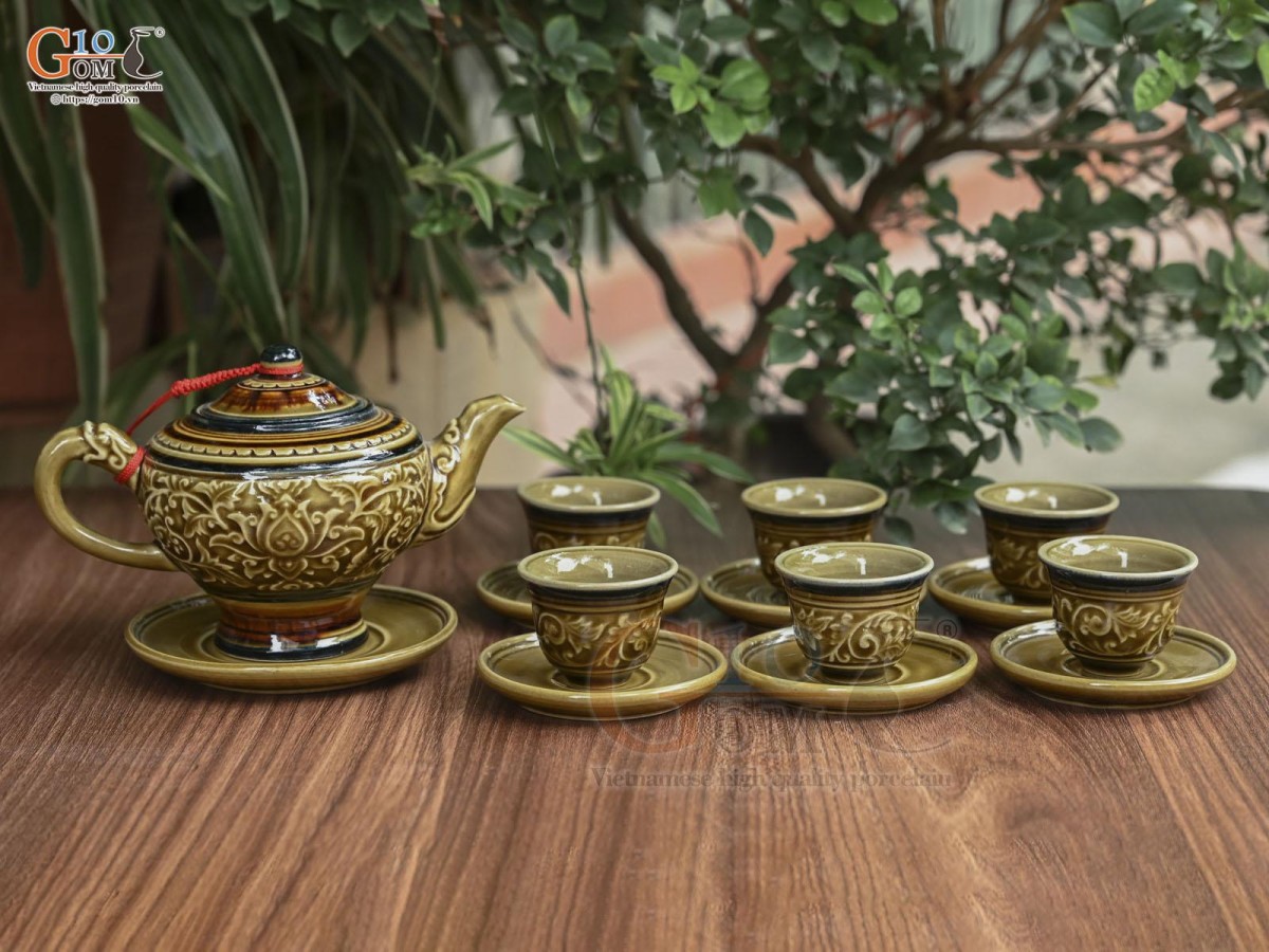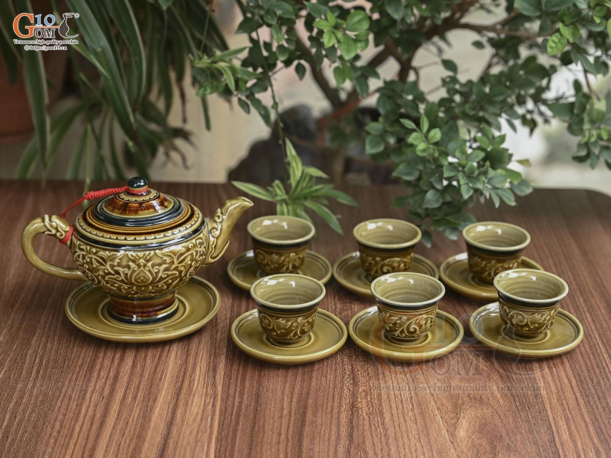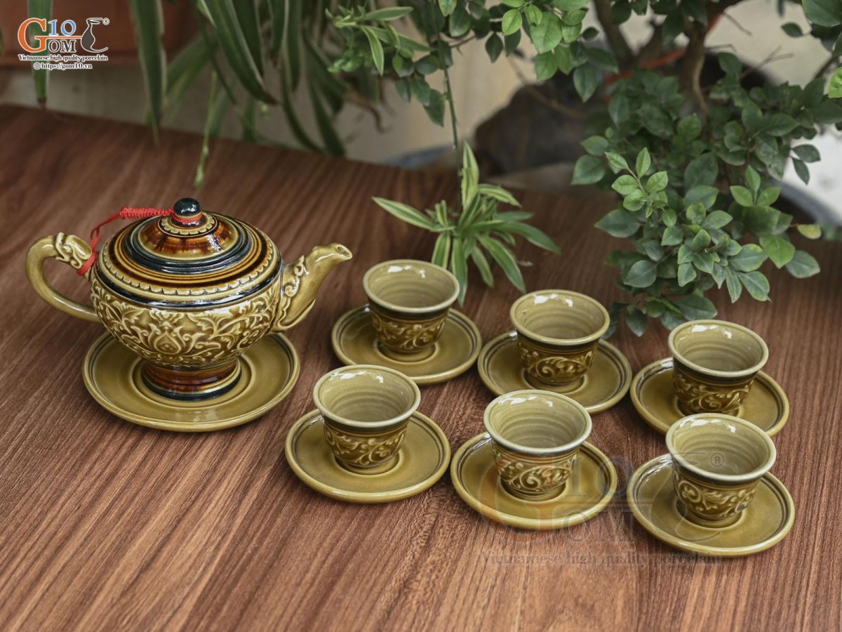 Bộ ấm chén dáng chân thon men cổ khắc nổi hoa sen màu vàng rêu, 350ml
