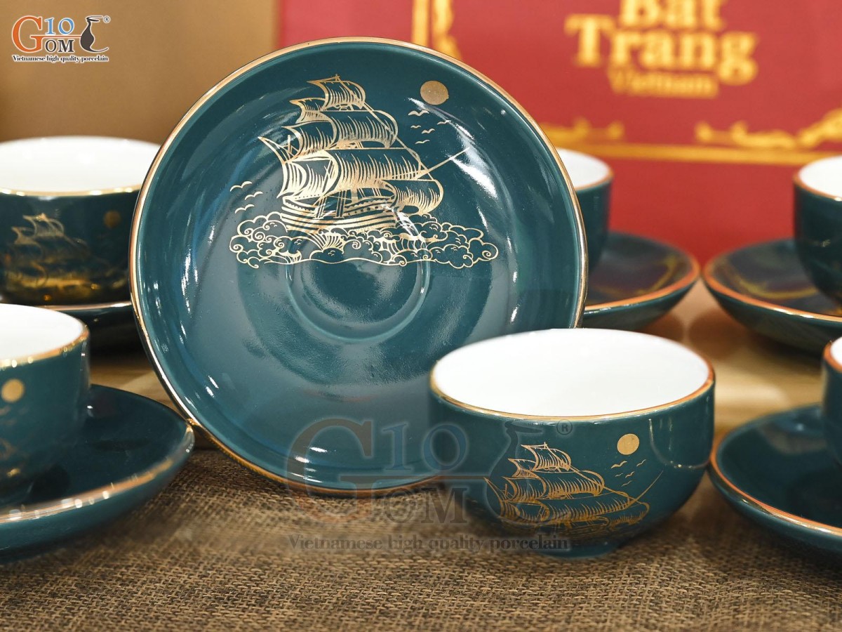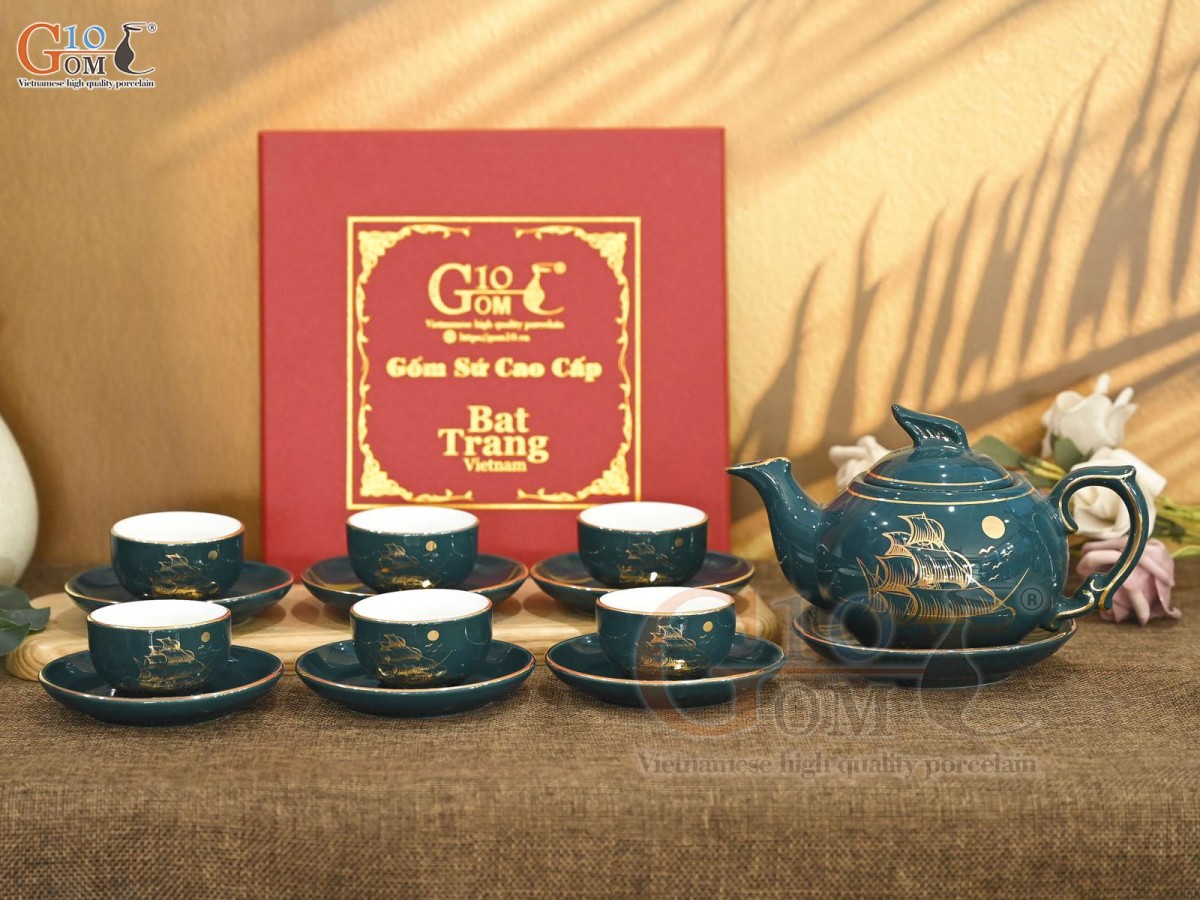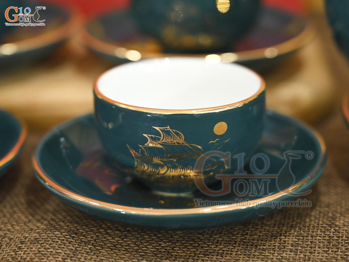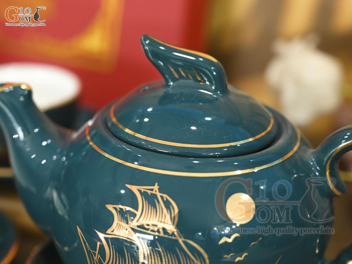 Bộ ấm chén dáng chim lạc men xanh họa tiết Thuận Buồm Xuôi Gió, 350ml