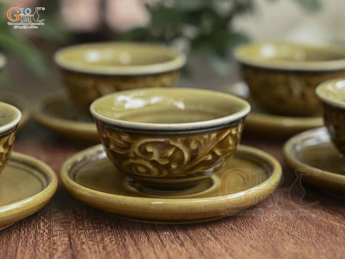Ngoài ra, ấm chén khắc chìm họa tiết cũng là sản phẩm cao cấp của dòng ấm chén men màu bởi sự tinh sảo tài tình của người nghệ nhân. Tiêu biểu chính là những mẫu ấm chén men nâu chỉ đỏ hoặc men rêu khử với họa tiết chính là hoa mai trắng hay hoa sen rất đậm chất Việt Nam.