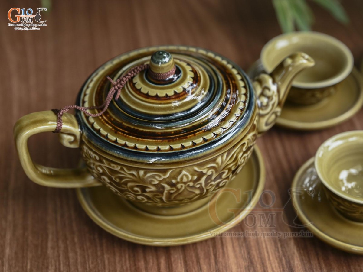 Bộ ấm chén dáng thấp men cổ khắc nổi hoa sen màu vàng rêu, 350ml