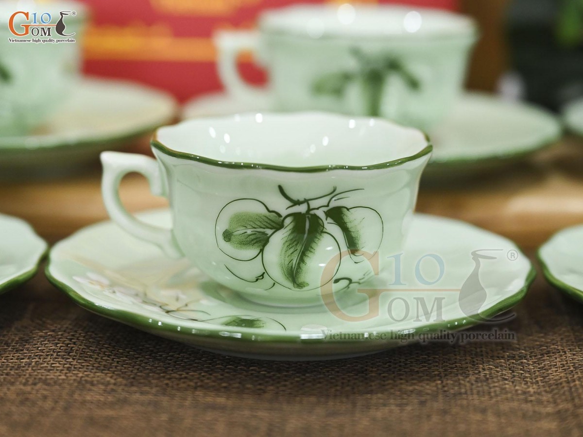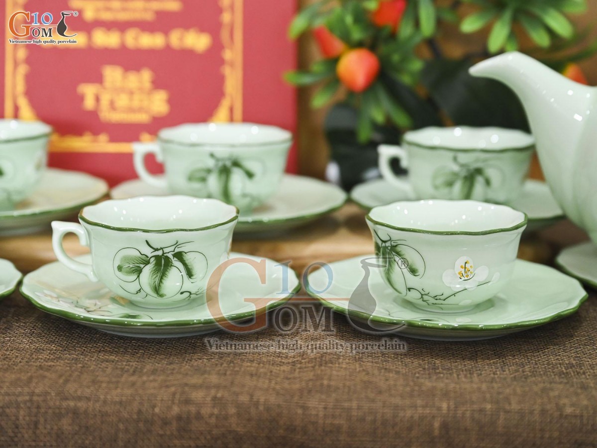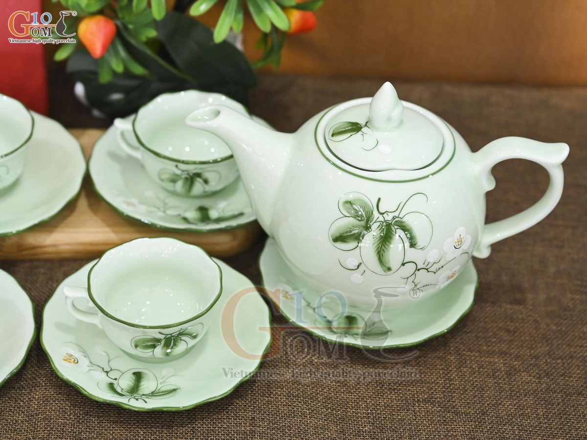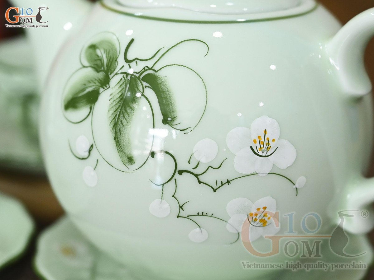 Bộ ấm chén mẫu đơn men ngọc vẽ hoa Bưởi, 650ml