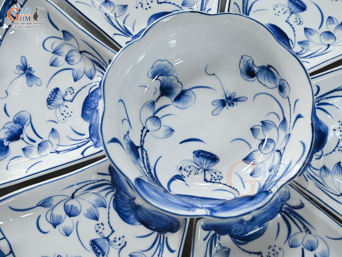 Bộ bát đĩa hoa mặt trời men trắng tô hoa vẽ hoa sen tràm chuồn, 45cm