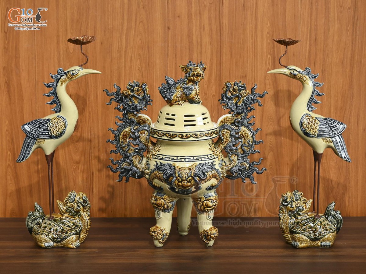Bộ đỉnh sứ thường bao gồm: Đỉnh sứ, đôi chân nến hoặc đôi hạc đứng trên lưng rùa. Tuy nhiên, các gia đình thường chọn đôi hạc thờ để sử dụng cho không gian thờ cúng bởi chúng sở hữu giá trị tâm linh, phong thủy sâu sắc. Theo phong thủy, hình tượng hạc cưỡi lưng rùa tượng trưng cho những điều tốt đẹp, cho mong ước truyền lại cho người đời sau.