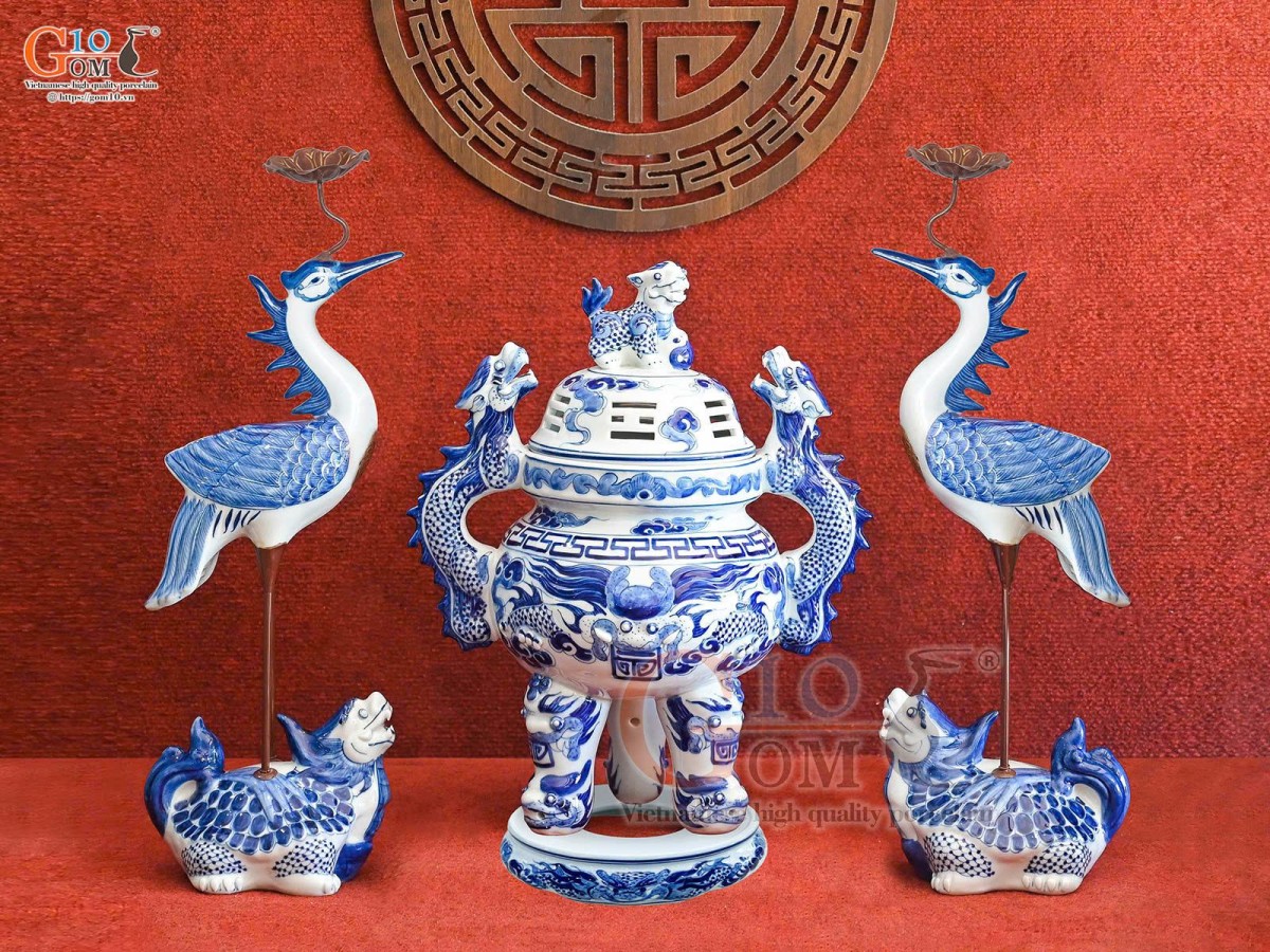 Bộ đỉnh sứ thường bao gồm: Đỉnh sứ, đôi chân nến hoặc đôi hạc đứng trên lưng rùa. Tuy nhiên, các gia đình thường chọn đôi hạc thờ để sử dụng cho không gian thờ cúng bởi chúng sở hữu giá trị tâm linh, phong thủy sâu sắc. Theo phong thủy, hình tượng hạc cưỡi lưng rùa tượng trưng cho những điều tốt đẹp, cho mong ước truyền lại cho người đời sau.