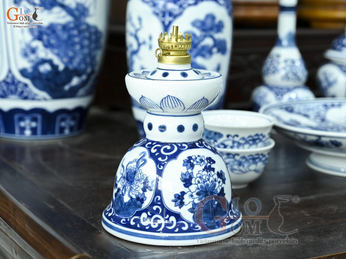 Đôi đèn dầu men trắng họa tiết Tứ Cảnh Tài Lộc, cao 20cm |