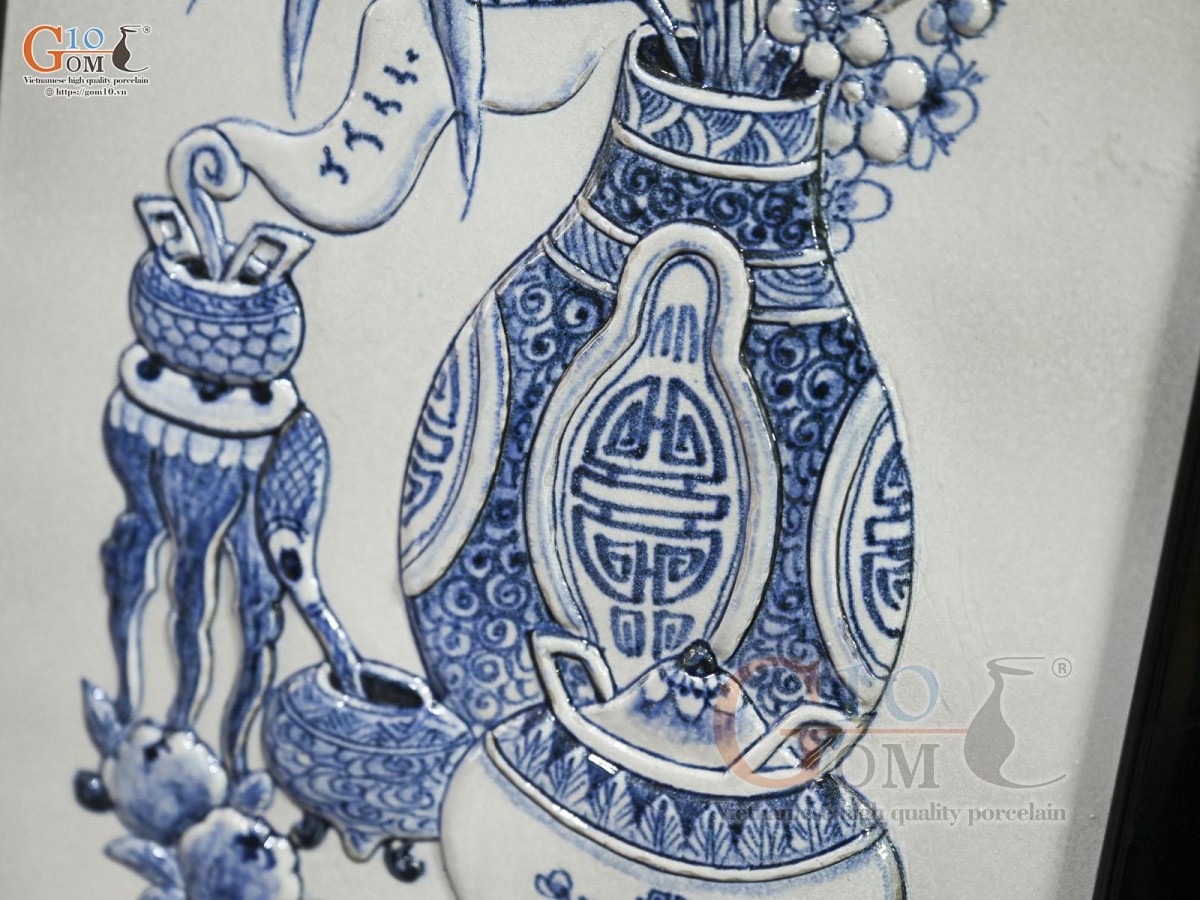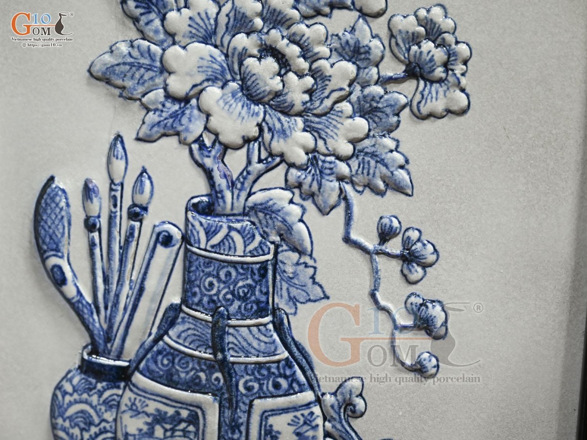 Khuôn tranh sau đó được xử lý sao cho nhẵn mịn và được người nghệ nhân vẽ hoặc đắp nổi họa tiết lên rồi phun men để sản phẩm được bóng đẹp. Tranh sứ thuộc dòng sản phẩm mang tính nghệ thuật cao nên người họa sĩ vẽ tranh phải có tay nghề để tác phẩm đạt được tính thẩm mỹ tối đa. Tranh đa số được khách hàng yêu thích các mẫu có họa tiết làng quê, phong cảnh, cây đa bến nước con đò… vì đó là những hình ảnh quen thuộc gần gũi với người Việt Nam. Ngoài ra với khách hàng thích sự độc đáo thì có thể đặt tranh theo yêu cầu…