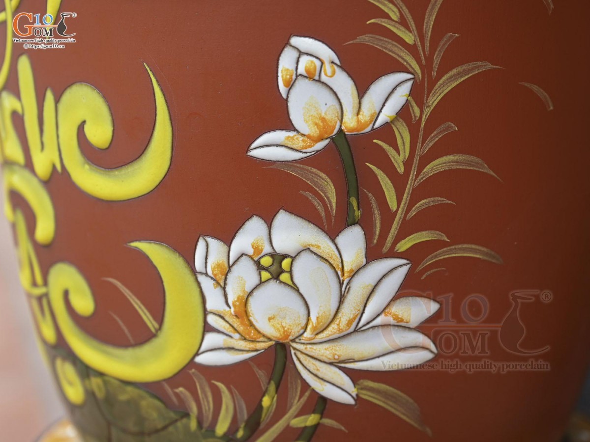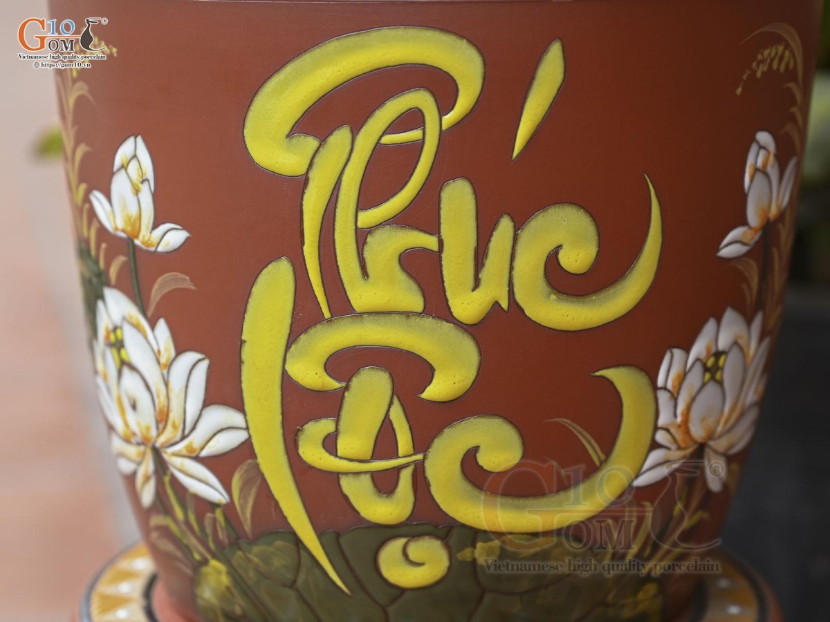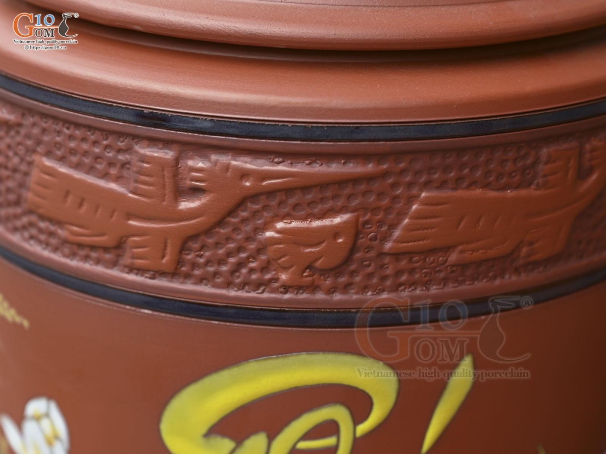 Chum gốm đất đỏ đựng gạo khắc hoa Sen Phúc Lộc, 10kg
