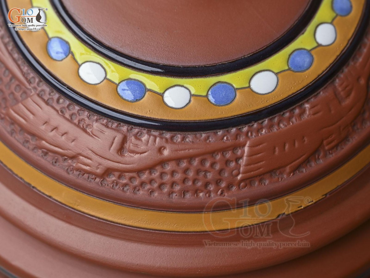 Chum rượu, hũ gạo men gốm được làm từ đất nung, là loại hàng nung không phủ men, giữ nguyên màu của đất sau khi nung, bề mặt chum có độ mịn, mát của đất cùng hoa văn Tài Lộc màu vàng đặc trưng; chống mối mọt, ẩm mốc, tránh bụi bẩn xâm nhập và không xảy ra phản ứng hóa học khi ngâm rượu/trữ gạo.
