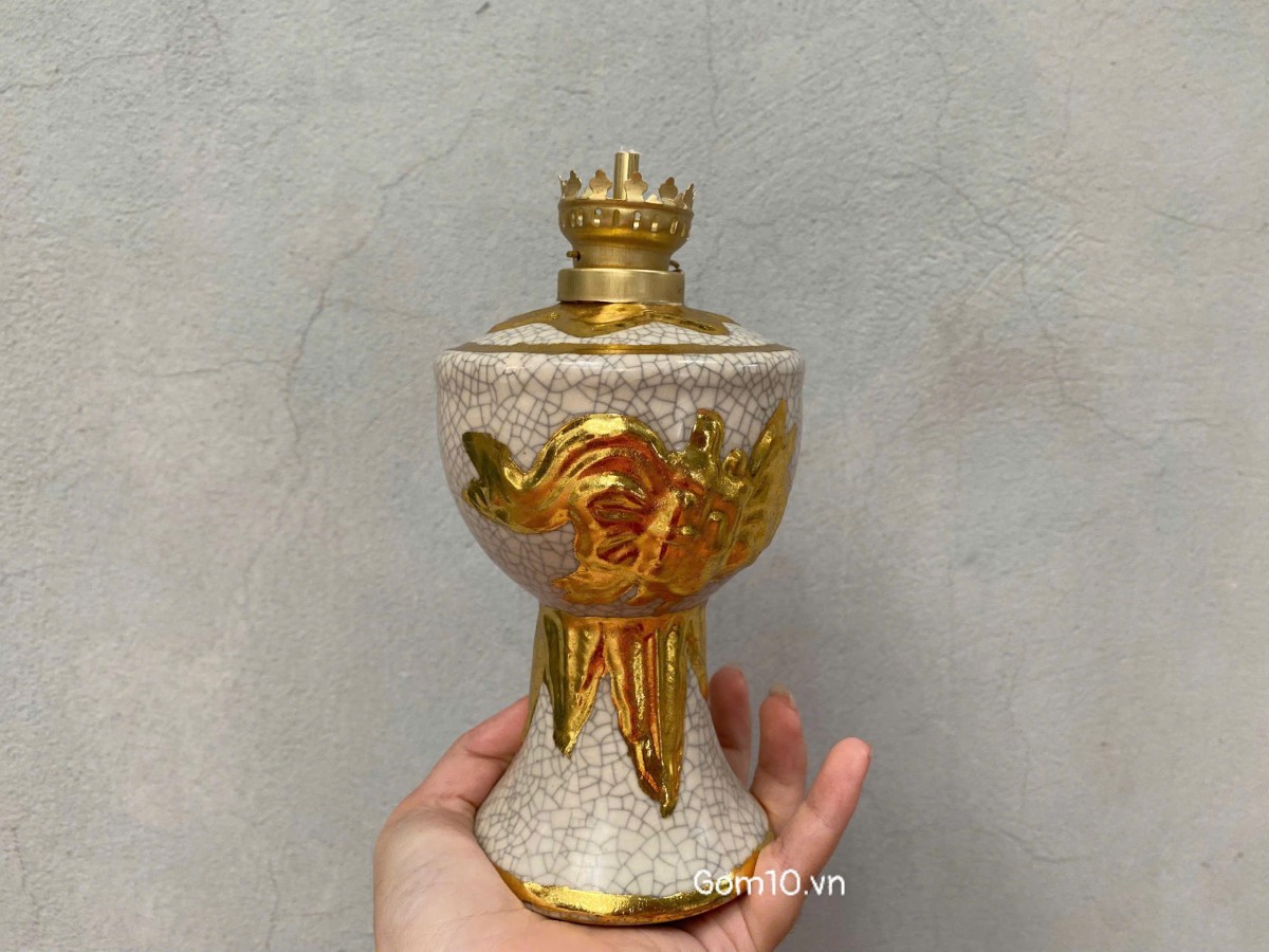 Đèn dầu gốm sứ. Được làm bằng gốm, tượng trưng cho mộc, kết hợp với Hỏa (Lửa) từ ngọn đèn sẽ đem lại phong thủy vận may cho sự thờ cúng của chúng ta.
