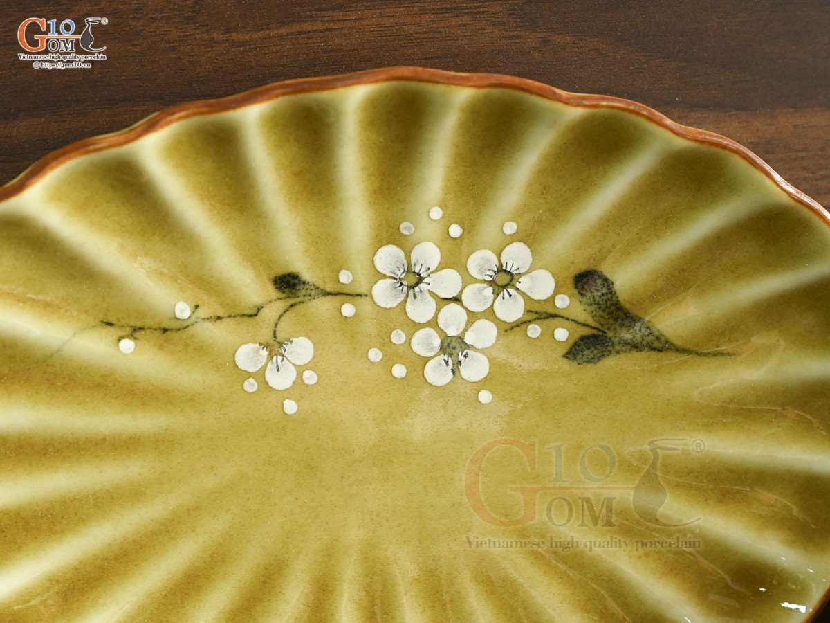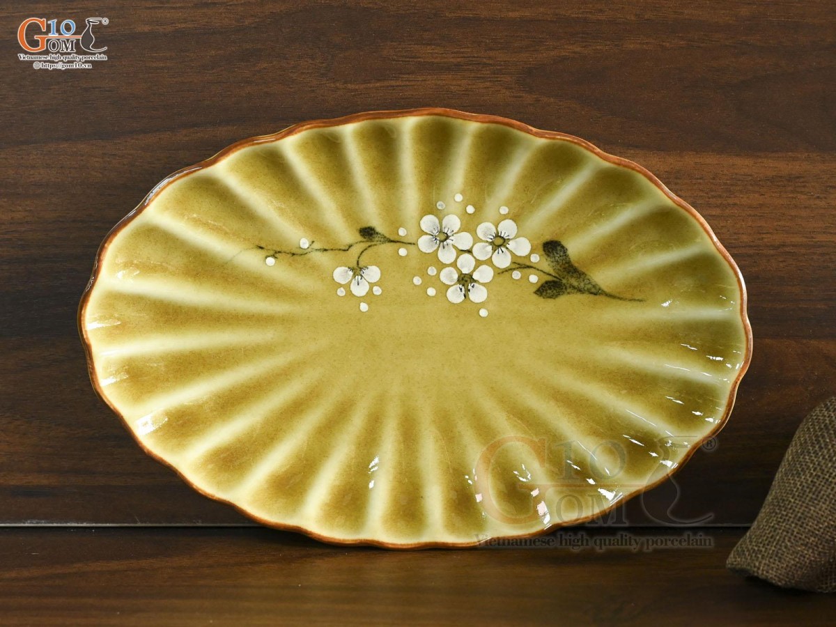 Đĩa bầu dục Hoàng thổ họa tiết Hoa Đào 31x21cm Đĩa bầu dục Hoàng thổ họa tiết Hoa Đào 31x21cm Đĩa bầu dục Hoàng thổ họa tiết Hoa Đào 31x21cm