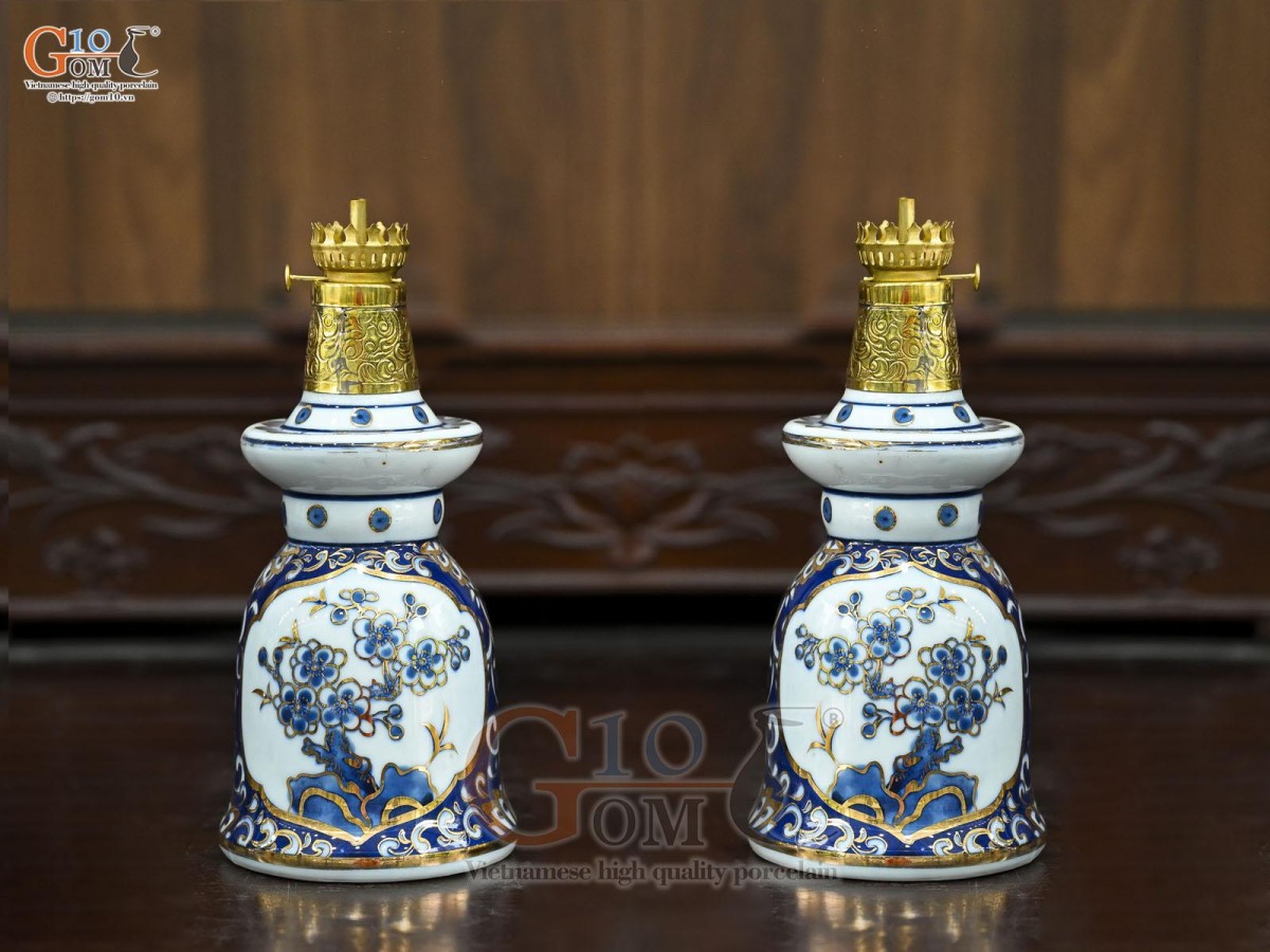 Đôi đèn dầu men trắng họa tiết Tài Lộc vẽ vàng 24k, cao 22cm
