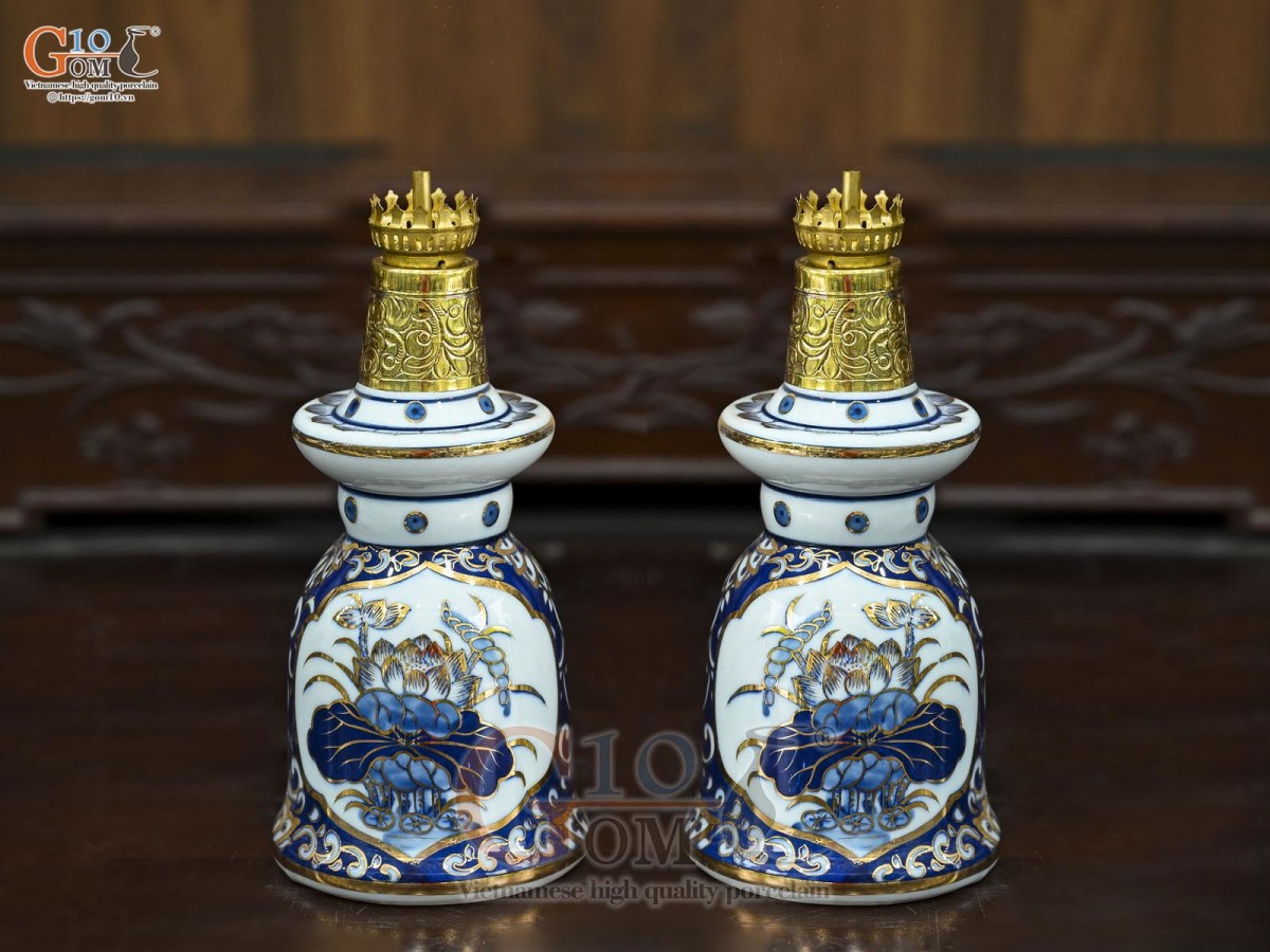 Đèn dầu gốm sứ. Được làm bằng gốm, tượng trưng cho mộc, kết hợp với Hỏa (Lửa) từ ngọn đèn sẽ đem lại phong thủy vận may cho sự thờ cúng của chúng ta.