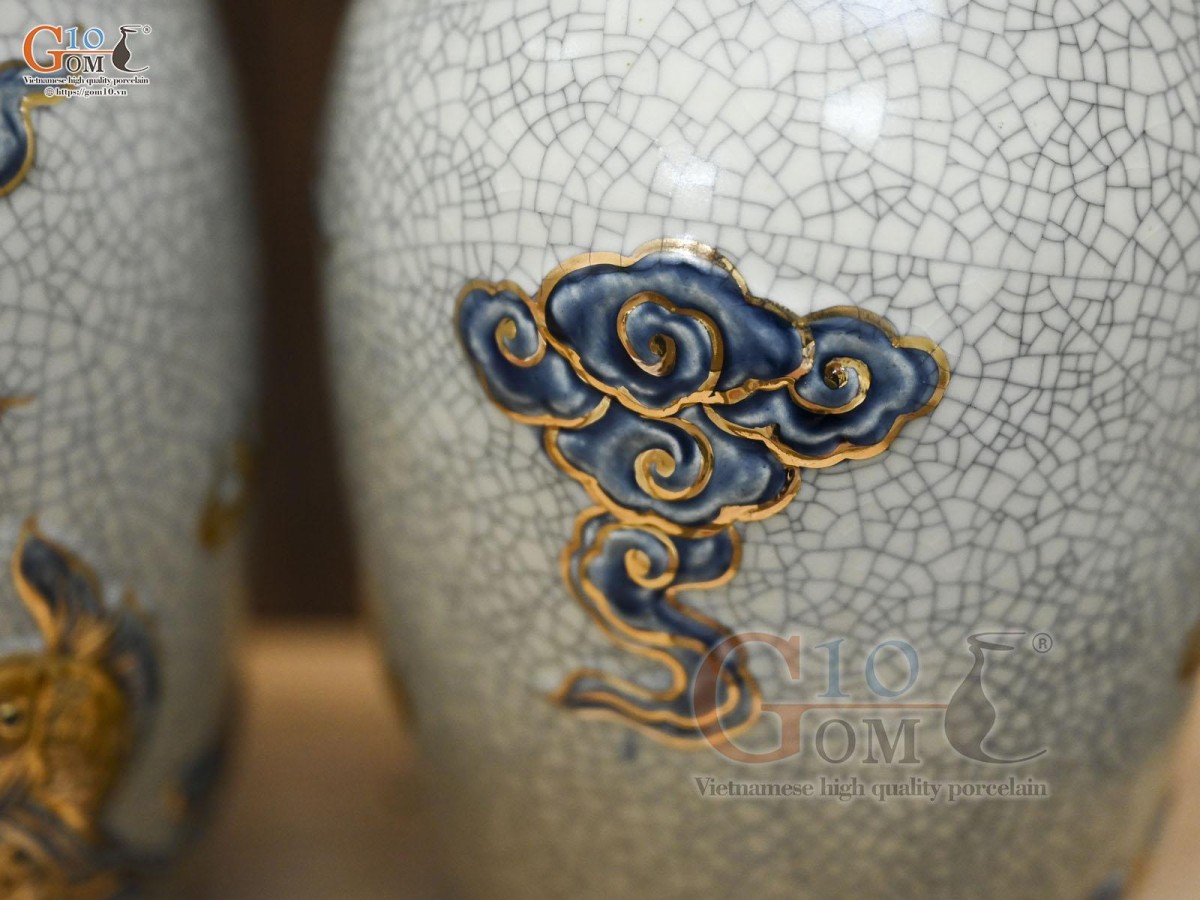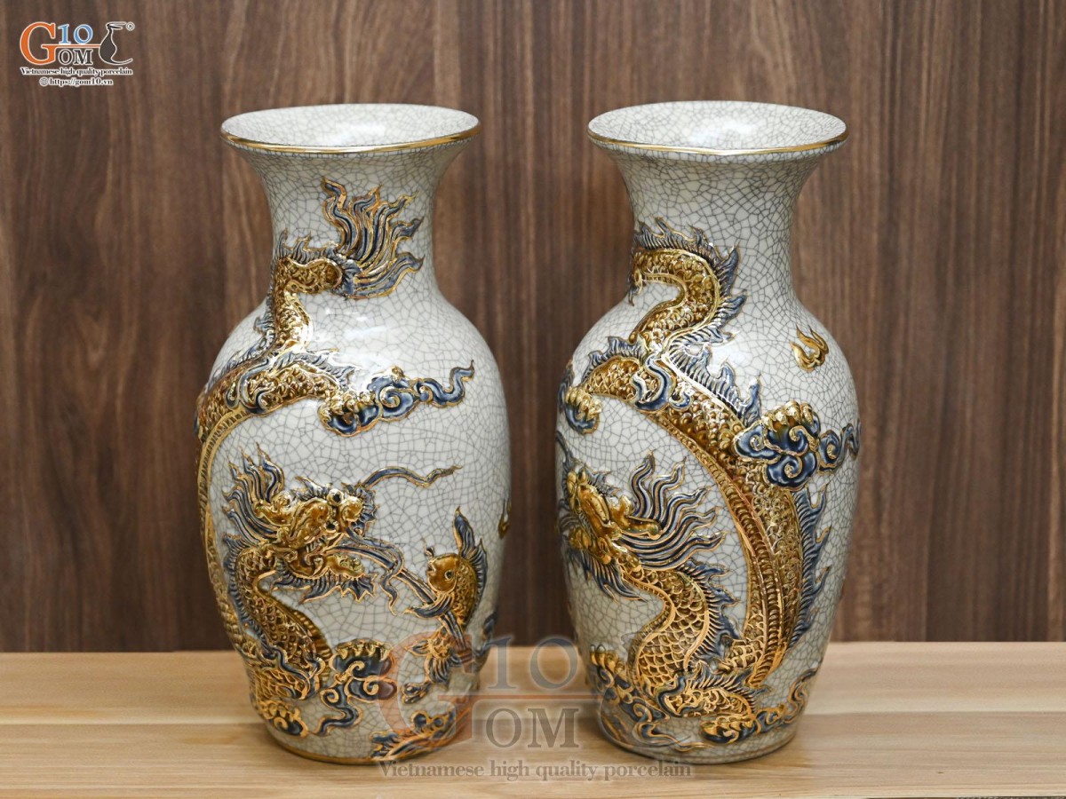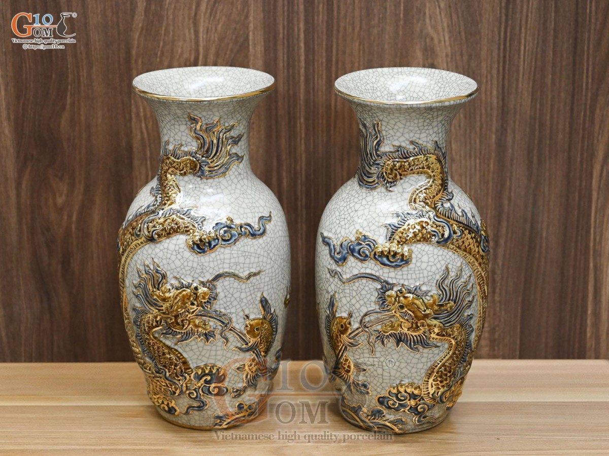 Đôi lọ hoa dáng lộc bình men rạn đắp nổi Rồng Như Ý vẽ vàng 24k, cao 32cm
