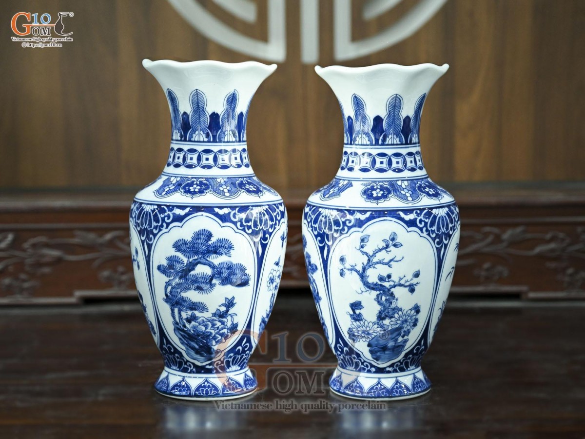 Đội lọ hoa miệng lượn men trắng họa tiết Tứ Cảnh Tài Lộc, cao 35cm