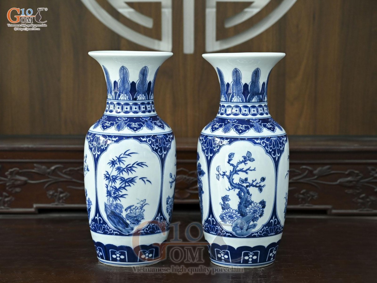Đôi lọ lộc bình men trắng họa tiết Tứ Cảnh, cao 35cm