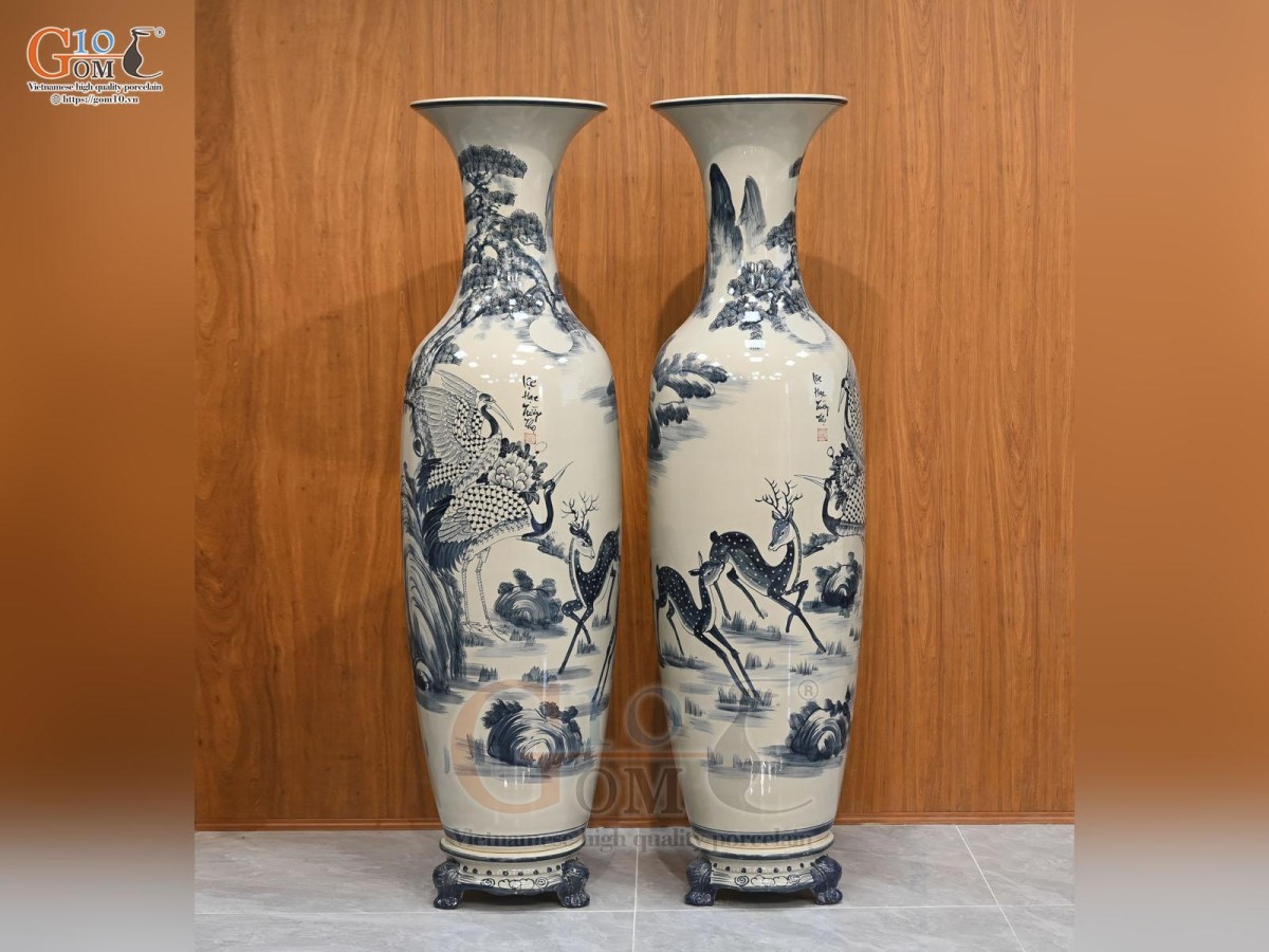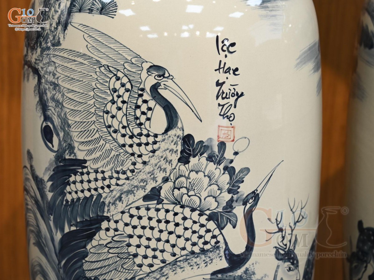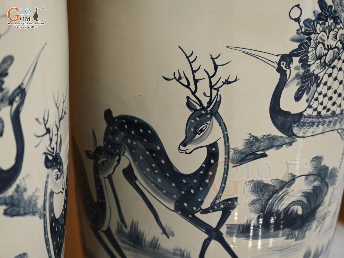 Đôi lộc bình men chàm cổ vẽ Lộc Hạc Trường Thọ, cao 1m75