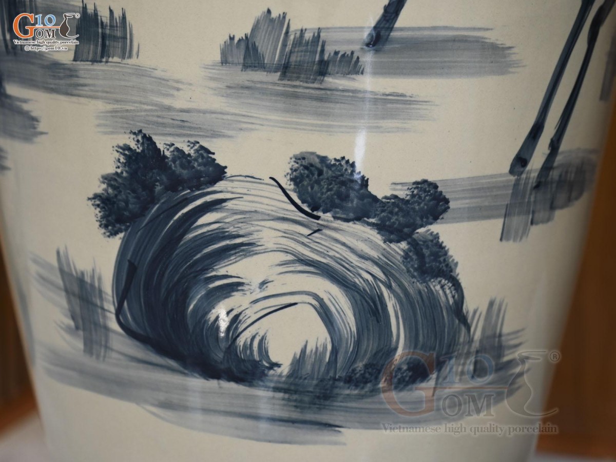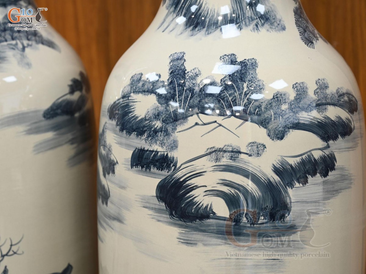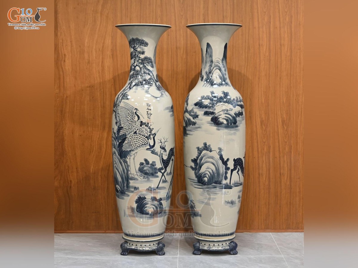 Đôi lộc bình men chàm cổ vẽ Lộc Hạc Trường Thọ, cao 1m75