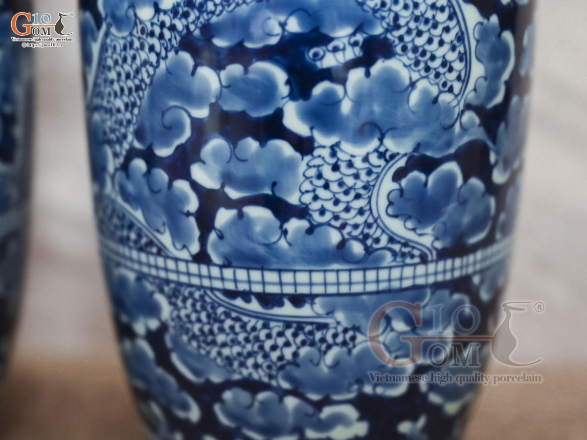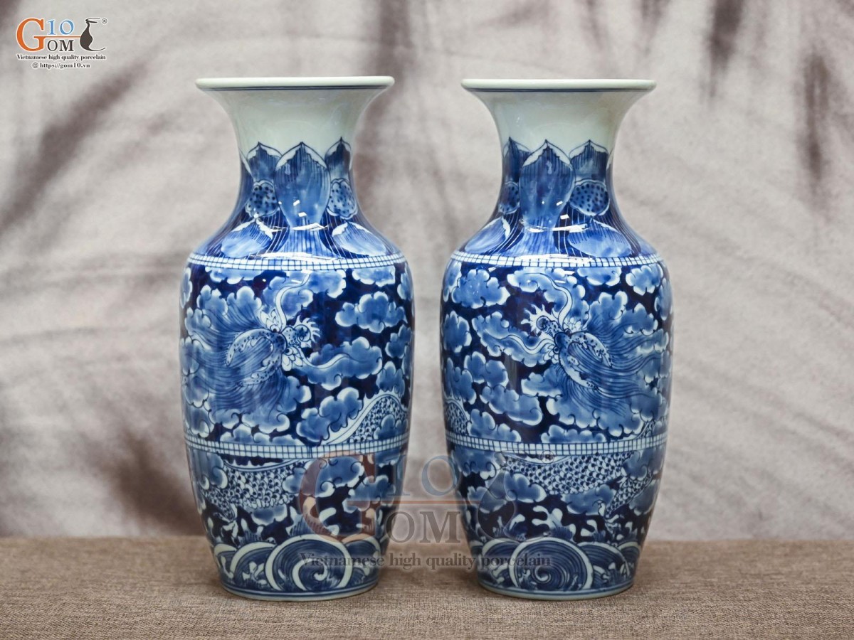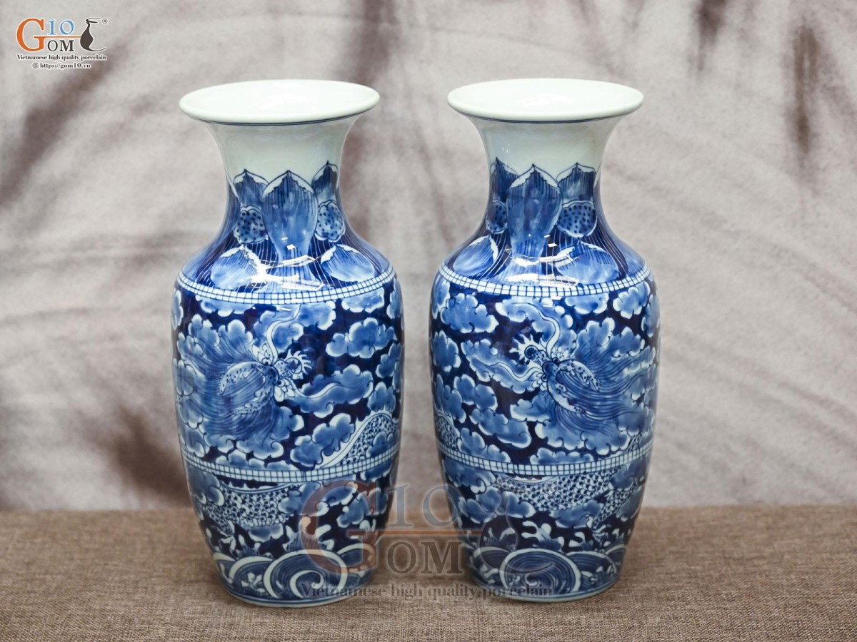 Đôi lộc bình men lam cổ vẽ Long Ẩn băng, cao 33cm