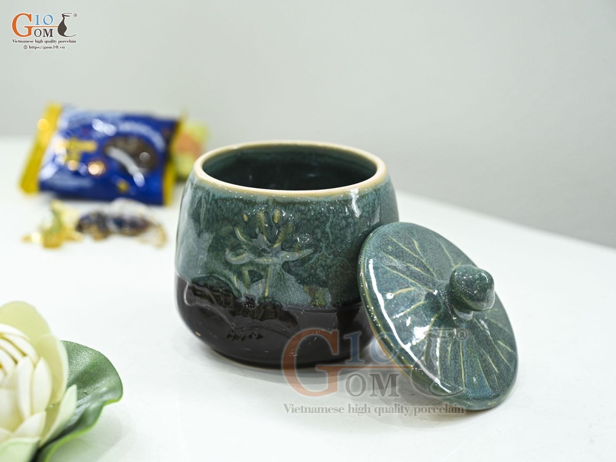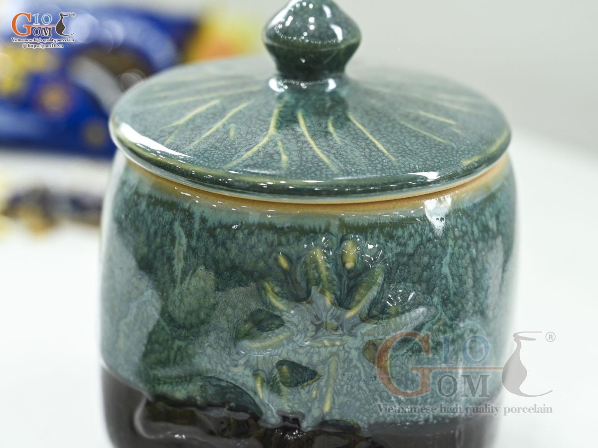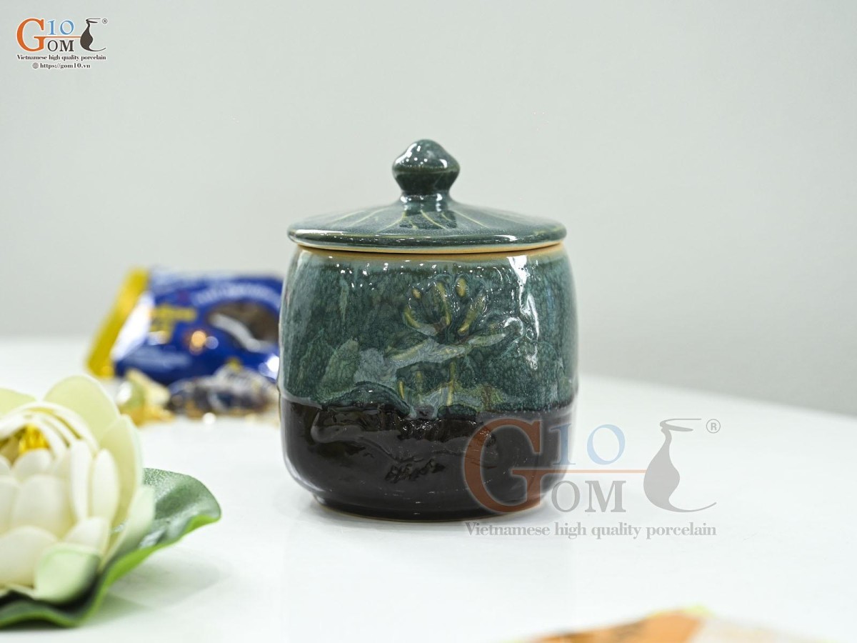 Hũ có nắp men hỏa biến đắp nổi hoa Sen, cao 12cm