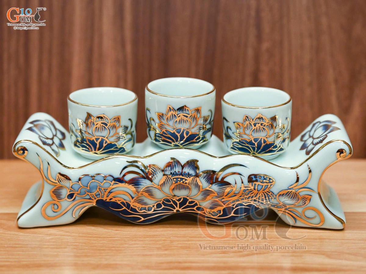 Kỷ ngai 3 chén men lam vẽ Sen Đại Cát, vẽ vàng 24k
