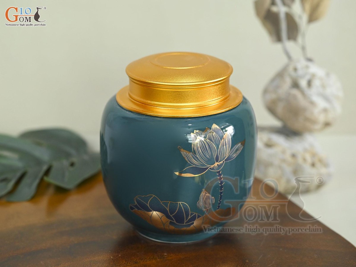Lọ chè dáng thấp họa tiết hoa Sen vàng kim, nền xanh dương, 150g