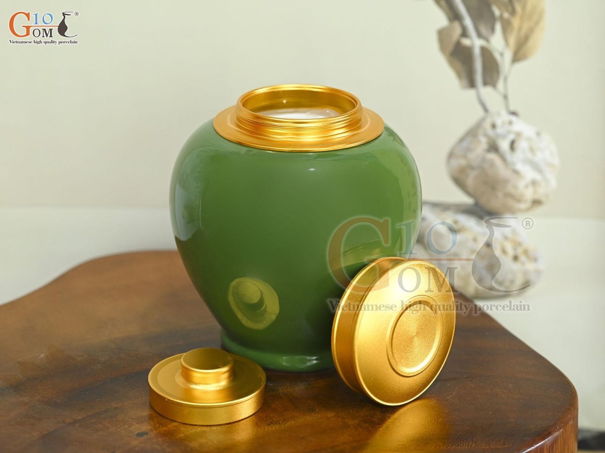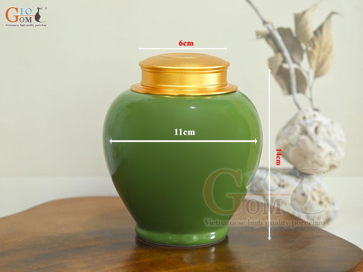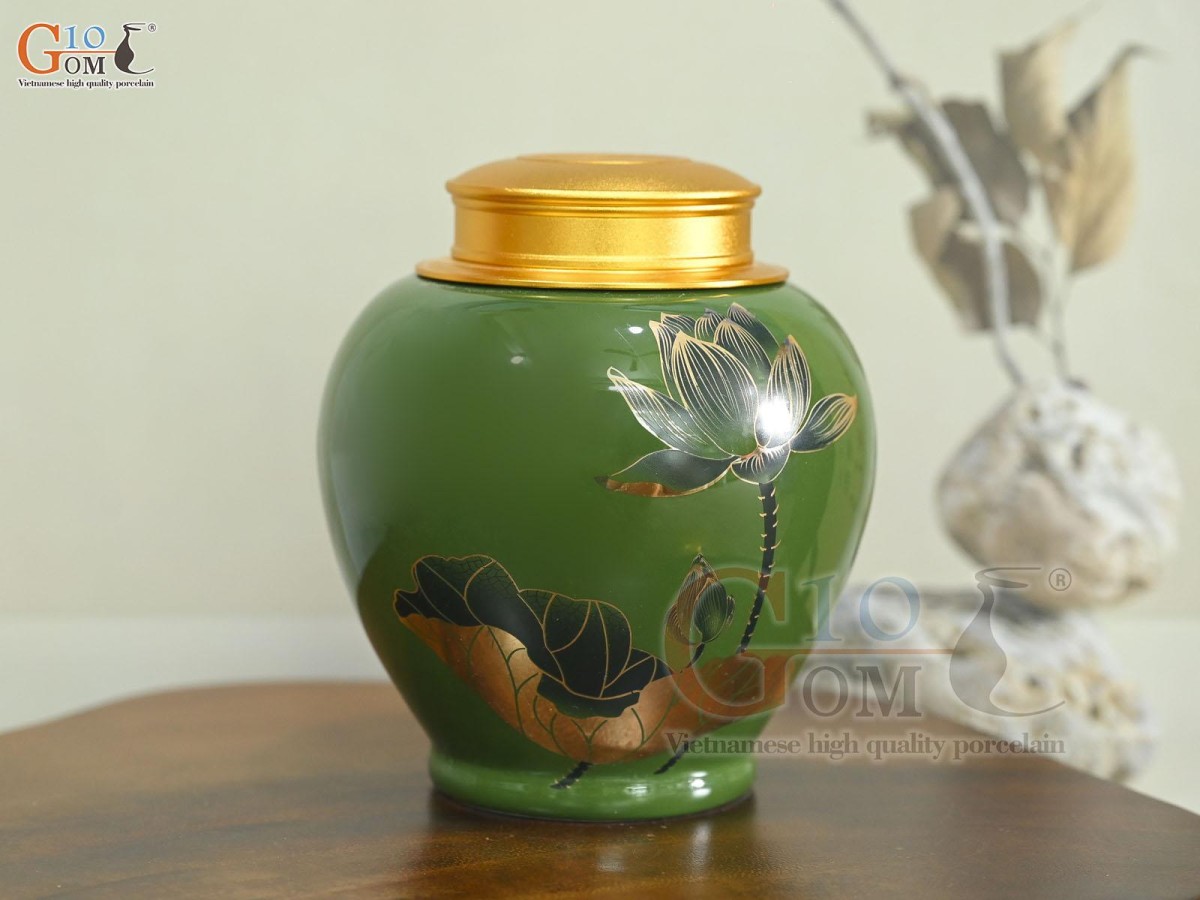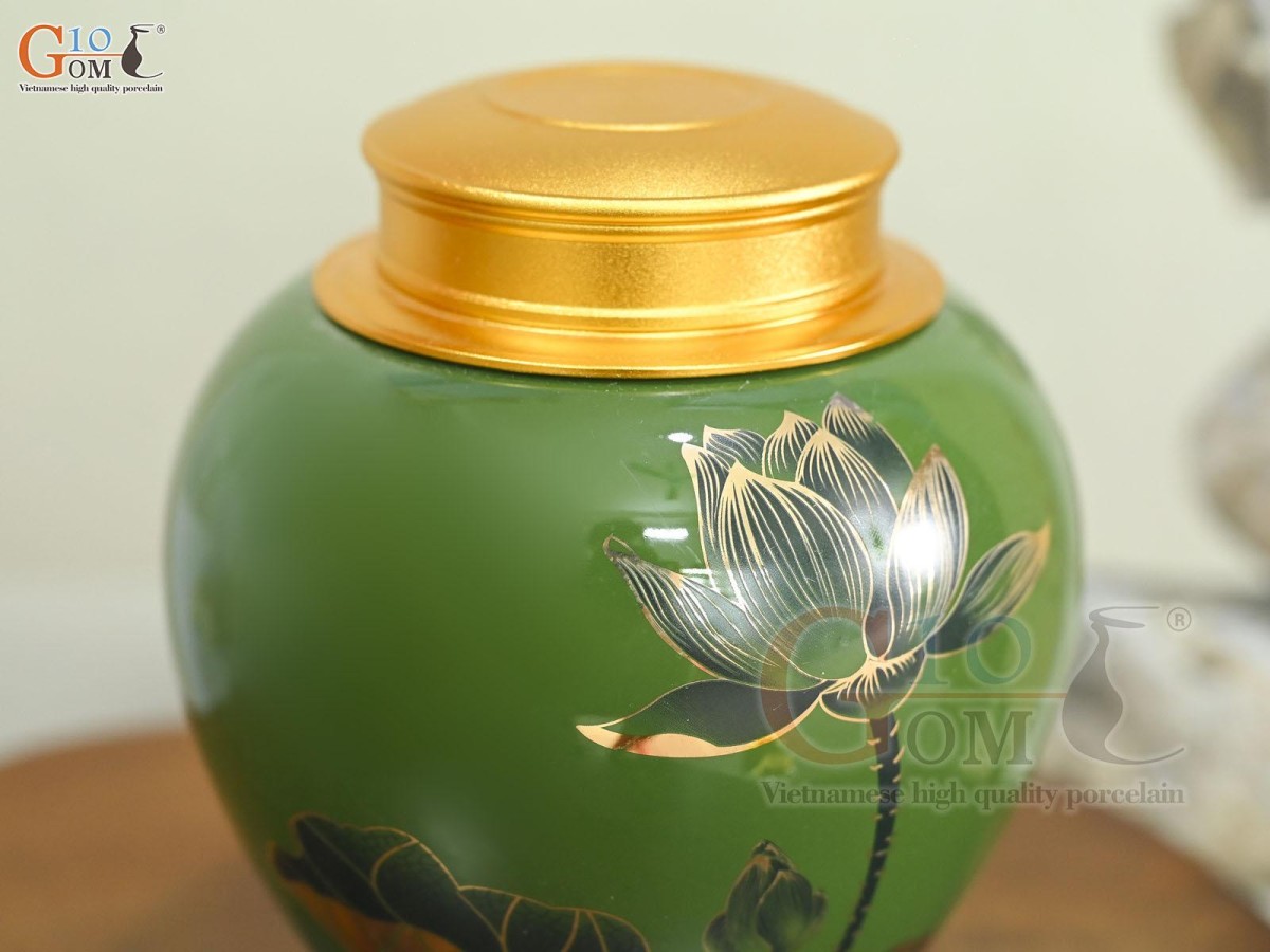 Lọ chè dáng tròn họa tiết hoa Sen vàng kim, nền xanh lá, 250g