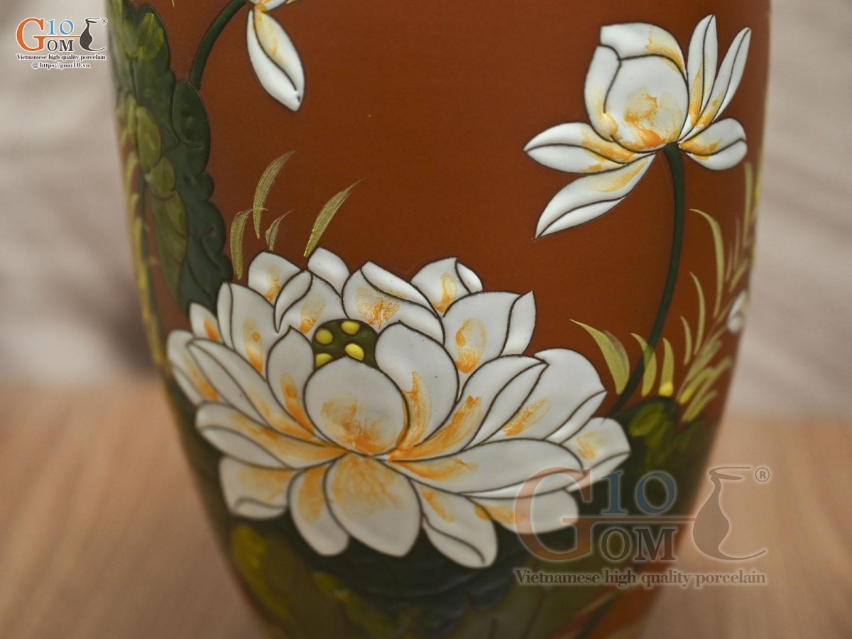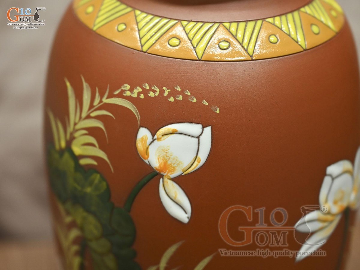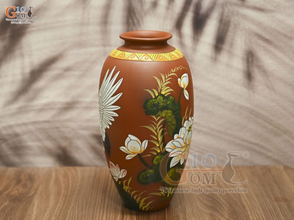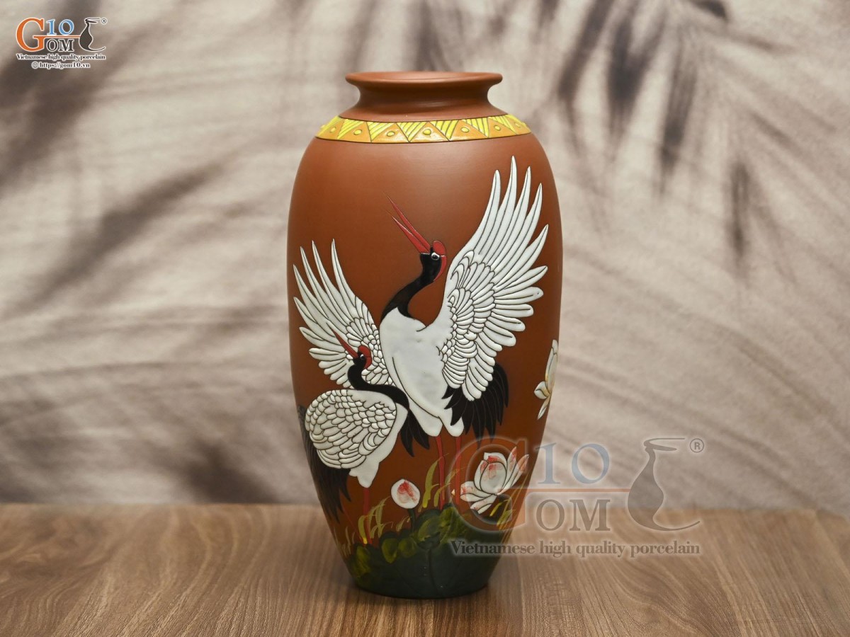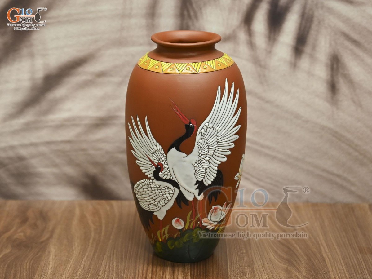 Lọ hoa gốm đất đỏ dáng soài khắc Song Hạc Liên Hoa, cao 40cm