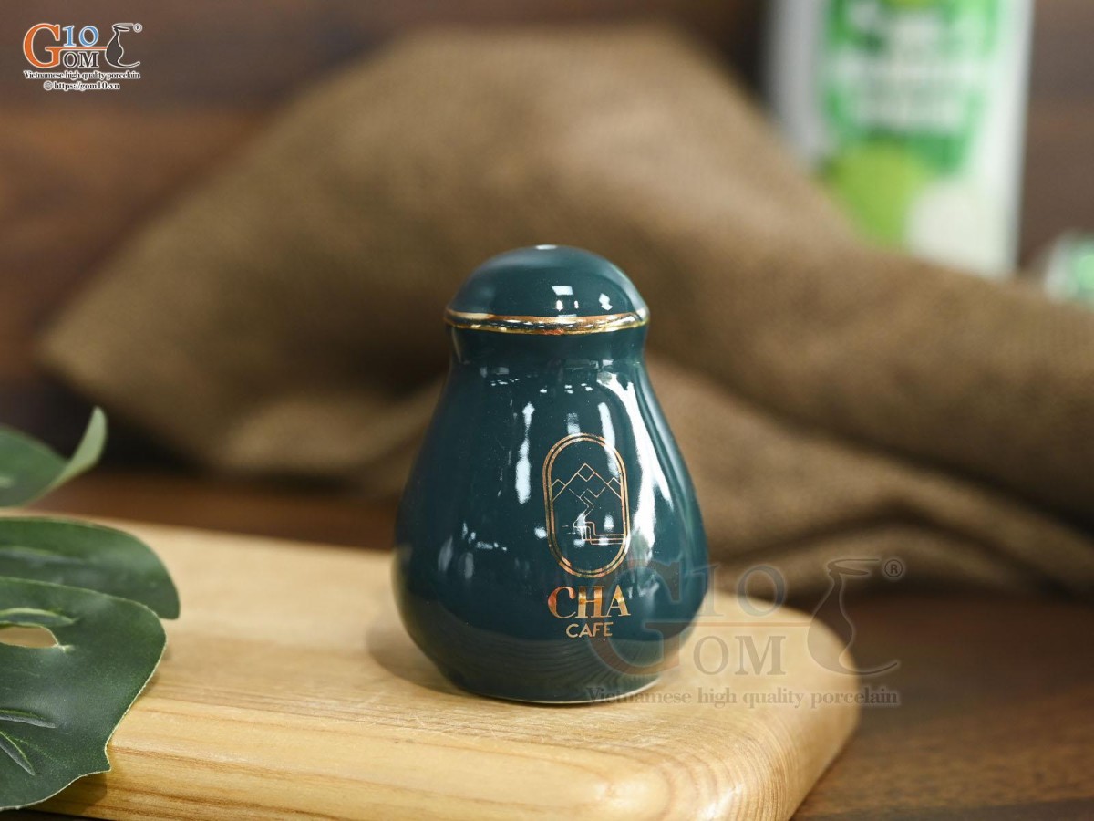 Lọ tiêu men xanh kẻ chỉ vàng kim, in logo Lọ tiêu men xanh kẻ chỉ vàng kim, in logo