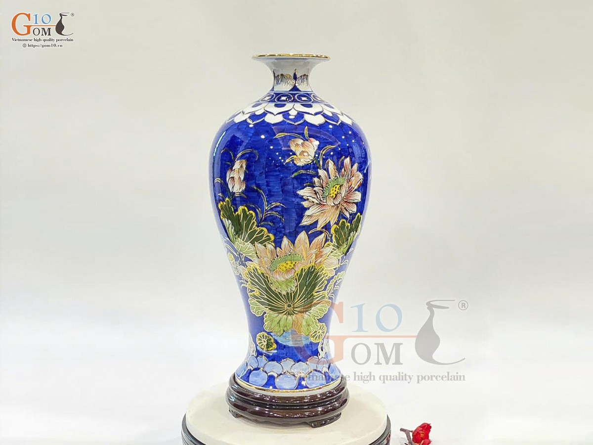 Mai bình men lam họa tiết Thuận Buồm Xuôi Gió & Liên Hoa Cát Tường, vẽ vàng 24k, cao 38cm Mai bình men lam họa tiết Thuận Buồm Xuôi Gió & Liên Hoa Cát Tường, vẽ vàng 24k, cao 38cm