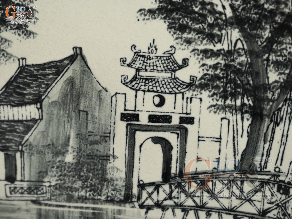 Tranh sứ cao cấp đen trắng vẽ cảnh cầu Thê Húc, 33x23cm