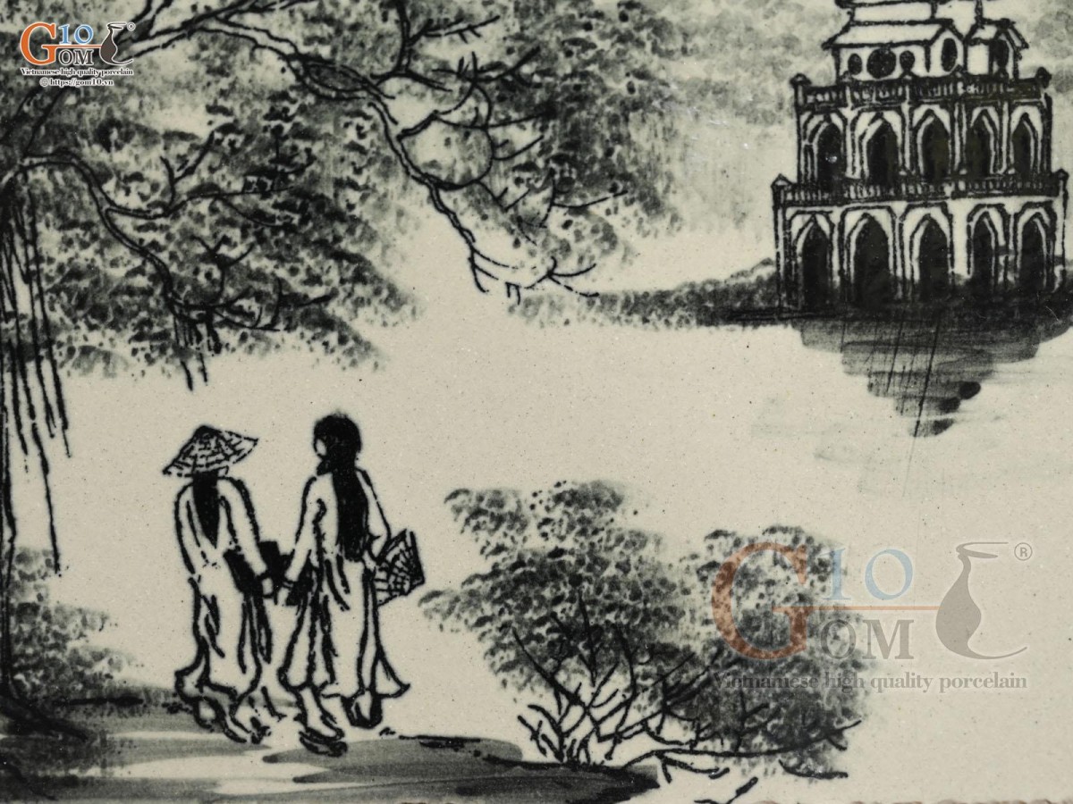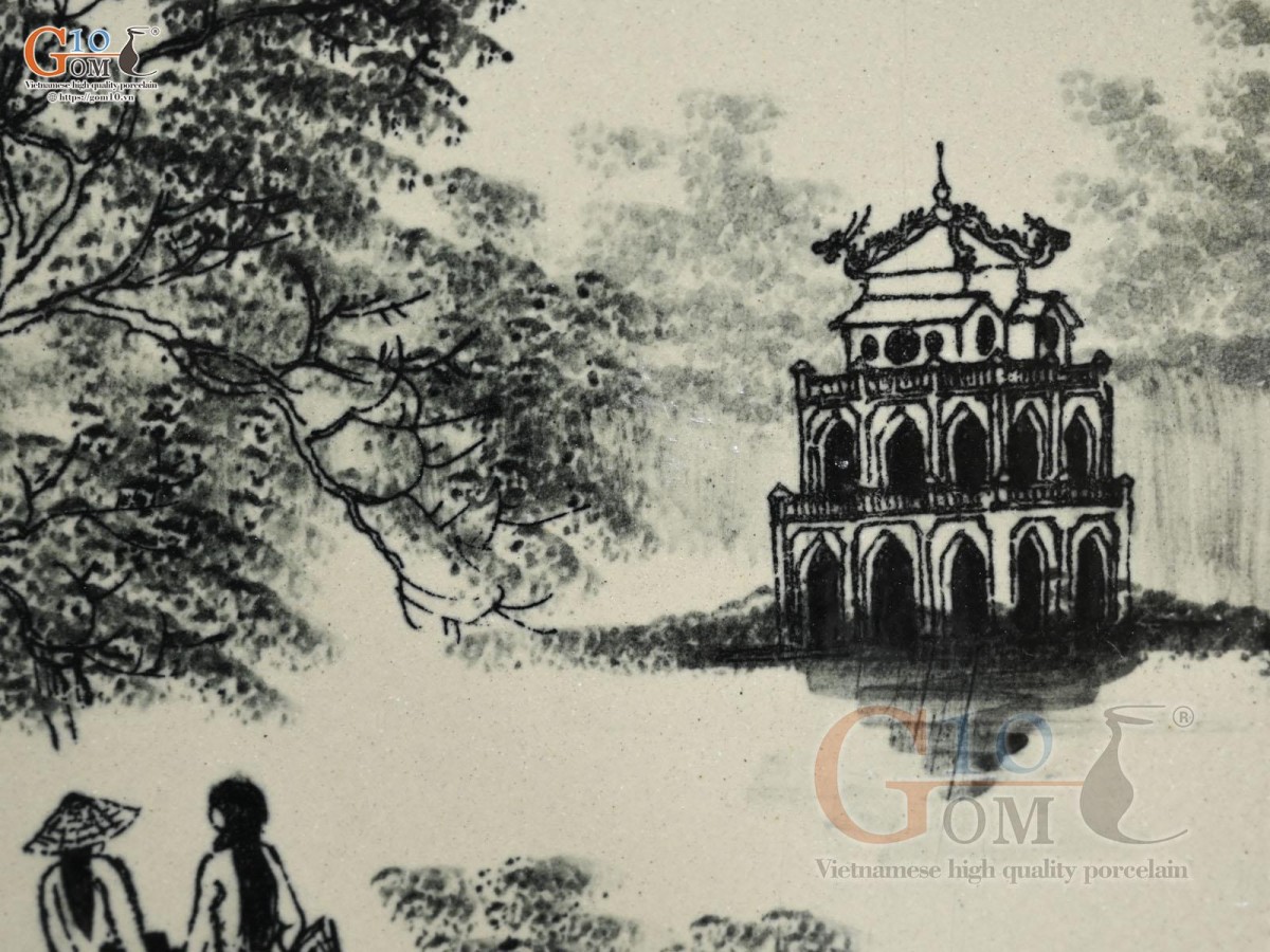 Tranh sứ cao cấp đen trắng vẽ cảnh Hồ Gươm, 33x23cm