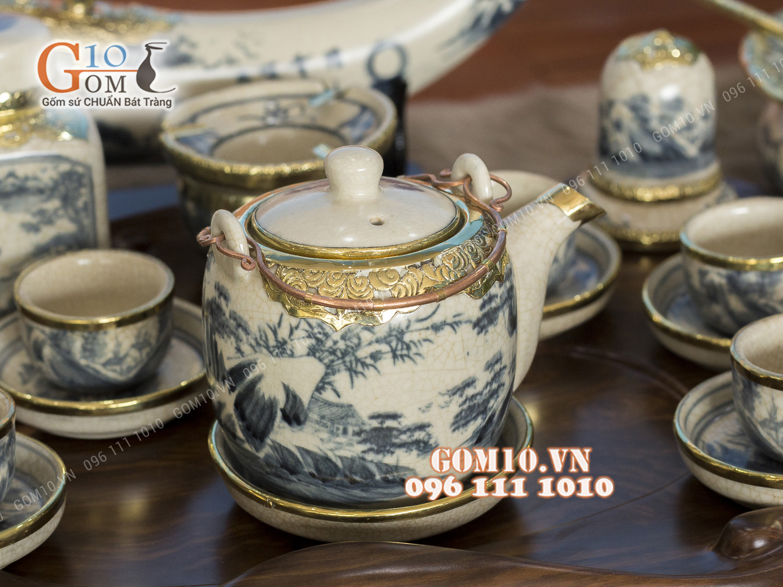 - Trang trí: Bộ ấm chén trà bọc đồng Bát Tràng được trang trí các cảnh vẽ phong phú, đẹp mắt, các mẫu trang trí được vẽ hoàn toàn bằng tay 100%, tạo điểm nhấn và sự khác biệt hoàn toàn với các dòng hoa văn thông thường. Các cảnh vẽ trên bộ ấm trà khắc họa các đường nét thanh mảnh, đẹp mắt gồm cảnh: Sơn thủy hữu tình - Trúc Lâm Thất Hiền!