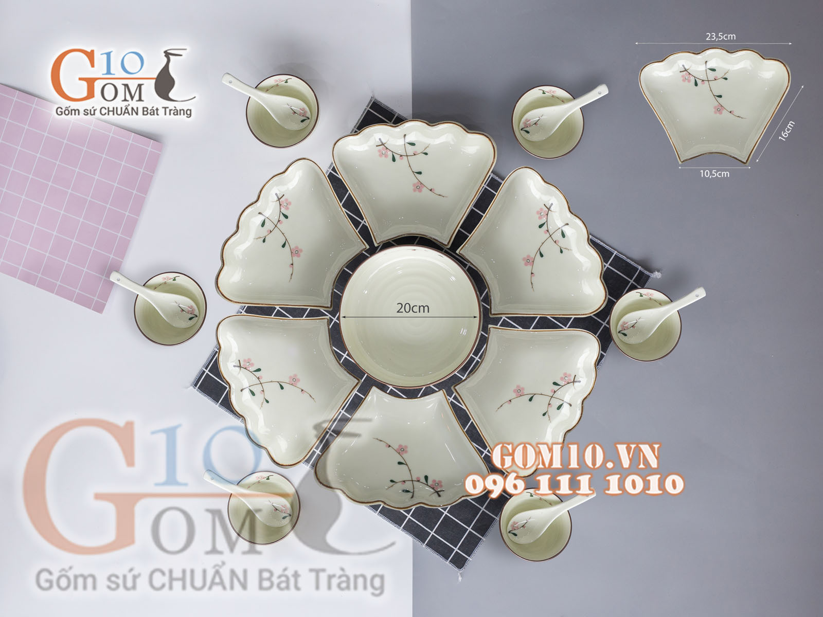 Bộ đĩa Hoa Mặt Trời men kem vẽ hoa Đào xanh