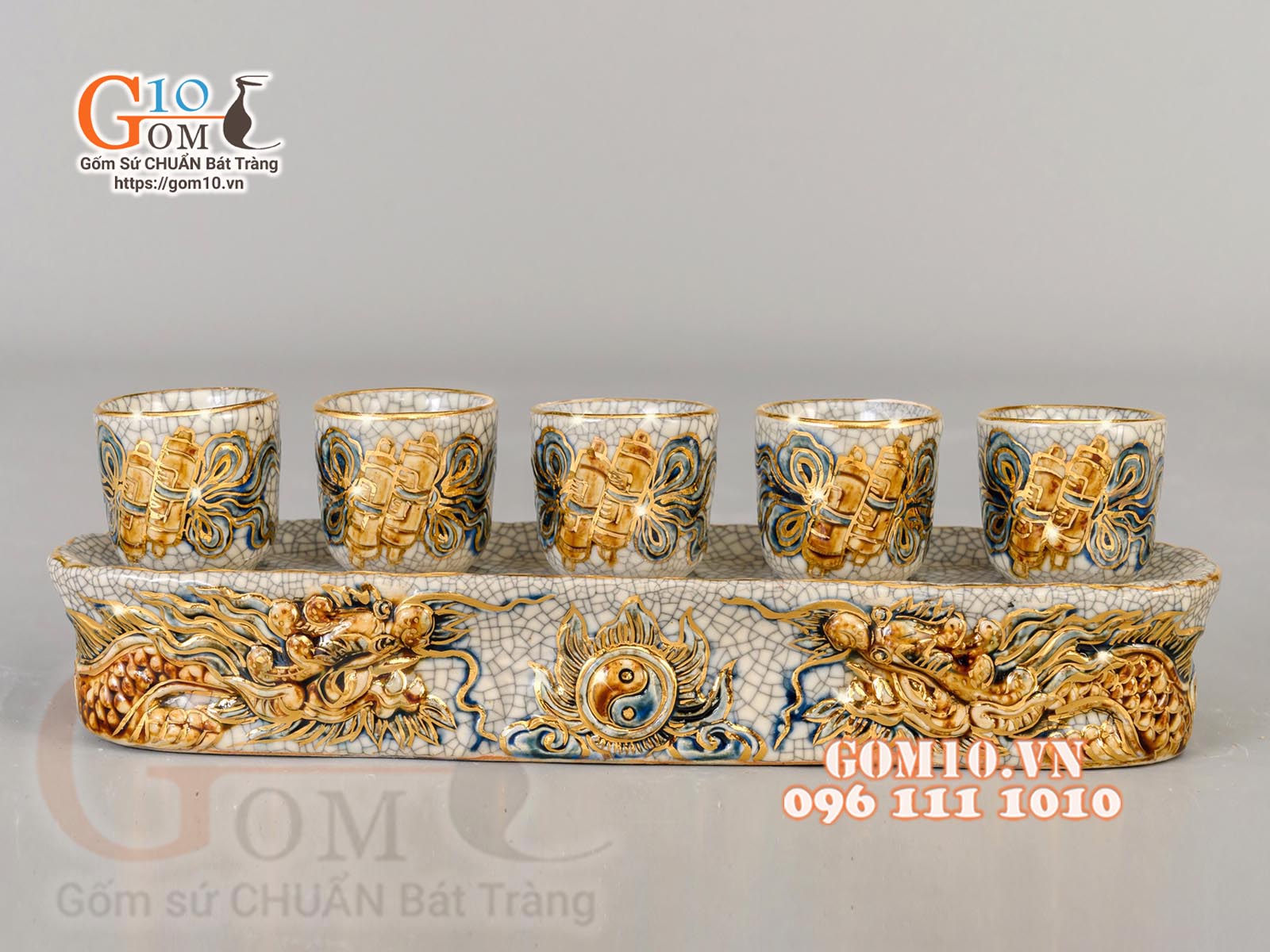Kỷ ngai 5 chén men rạn vẽ vàng hoạ tiết sen tinh khiết