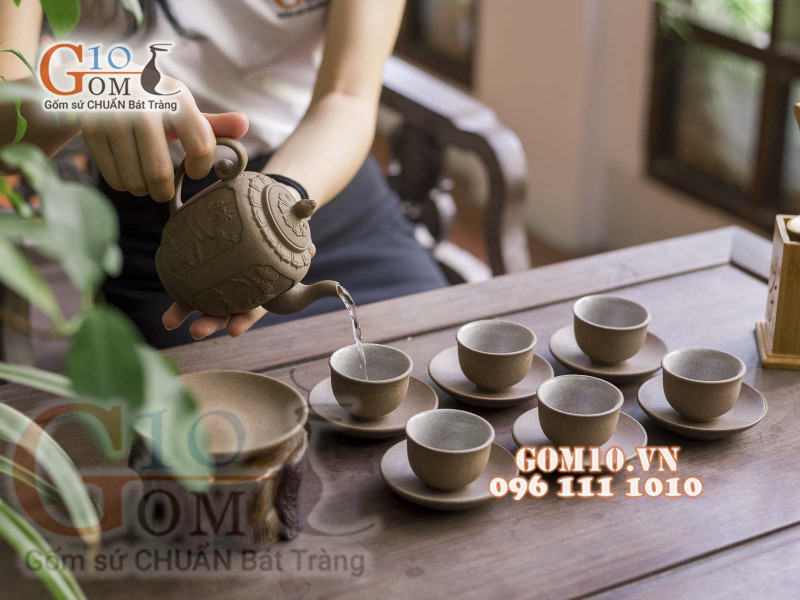 Bộ trà có sắc gan gà đặc trưng của cốt gốm, không tráng men, được người chế tác làm ra theo nhiều kiểu dáng khác nhau.