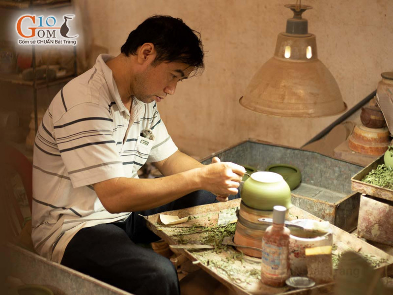 Người nghệ nhân đang sửa, tiện trau truốt lại phần ấm