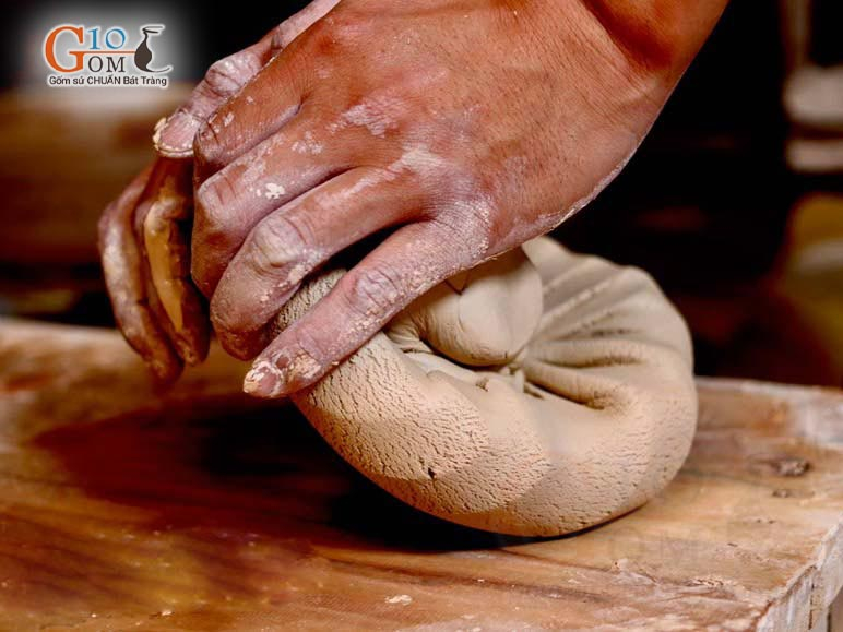 Hình ảnh người nghệ nhân nhào, nặn đất để nguyên liệu hòa vào nhau