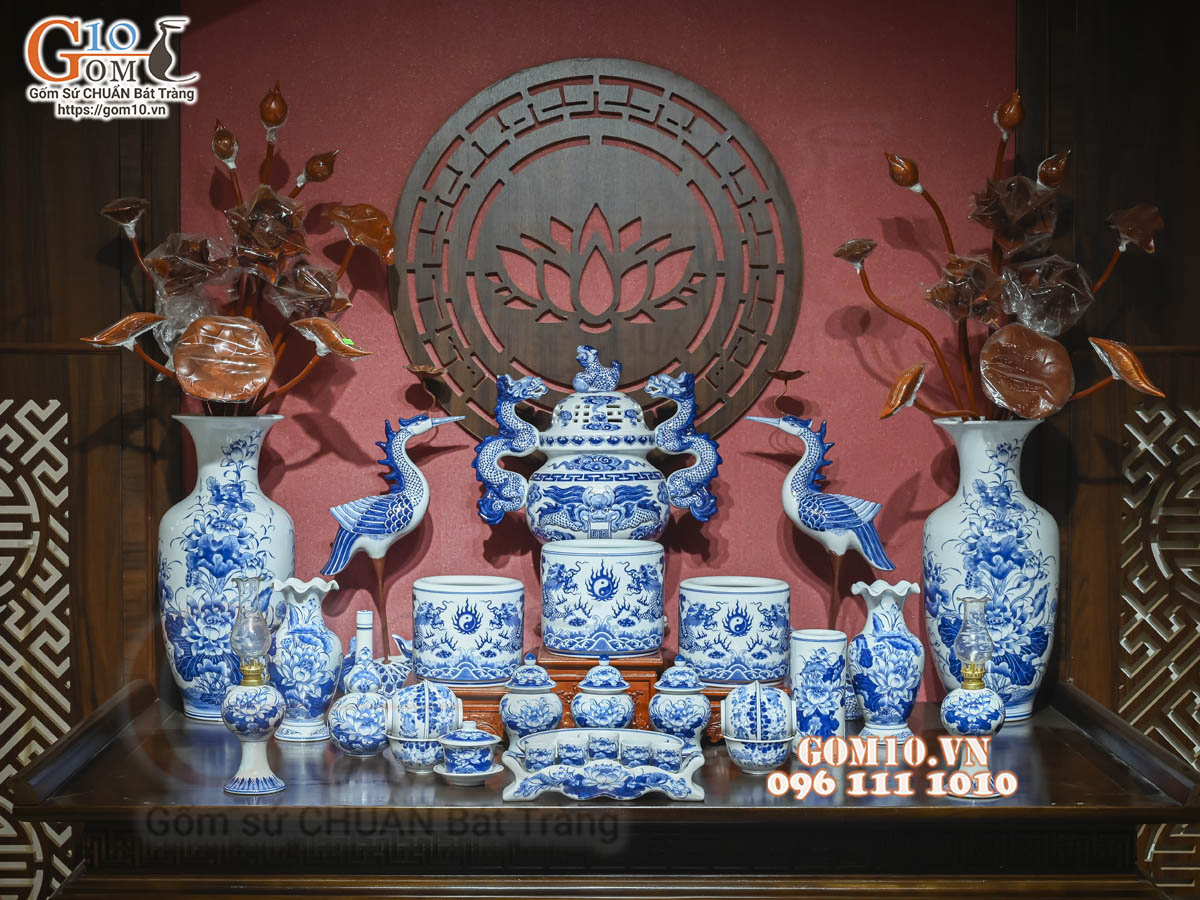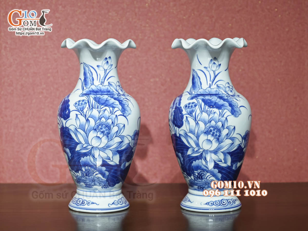 Bình hoa bàn thờ men lam là dòng lọ hoa thờ cúng đã có từ lâu đời của làng gốm Bát Tràng. Màu men lam quen thuộc kết hợp với những họa tiết vẽ hoa sen, tứ linh, mây cuộn,… đã khiến cho lọ hoa men được nhiều khách hàng yêu thích từ cái nhìn đầu tiên.