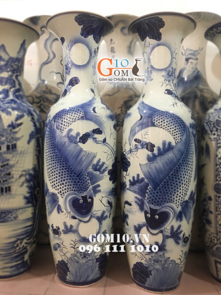 Cặp lộc bình men lam cổ vẽ lí ngư vọng nguyệt