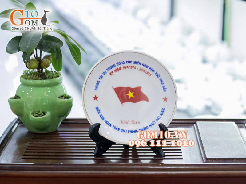 - Đĩa sứ biểu trưng làm quà tặng bằng gốm sứ thường bao gồm: Đĩa sứ có hình tròn và có chân đế kệ bằng gỗ đi kèm.