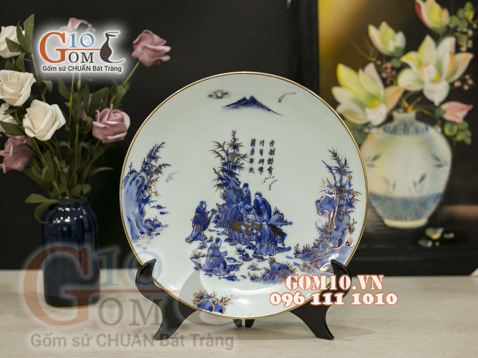 Đĩa sứ men lam vẽ cảnh Trúc lâm thất hiền vẽ vàng 24k